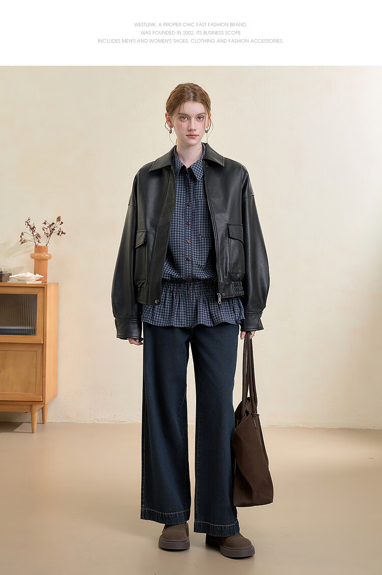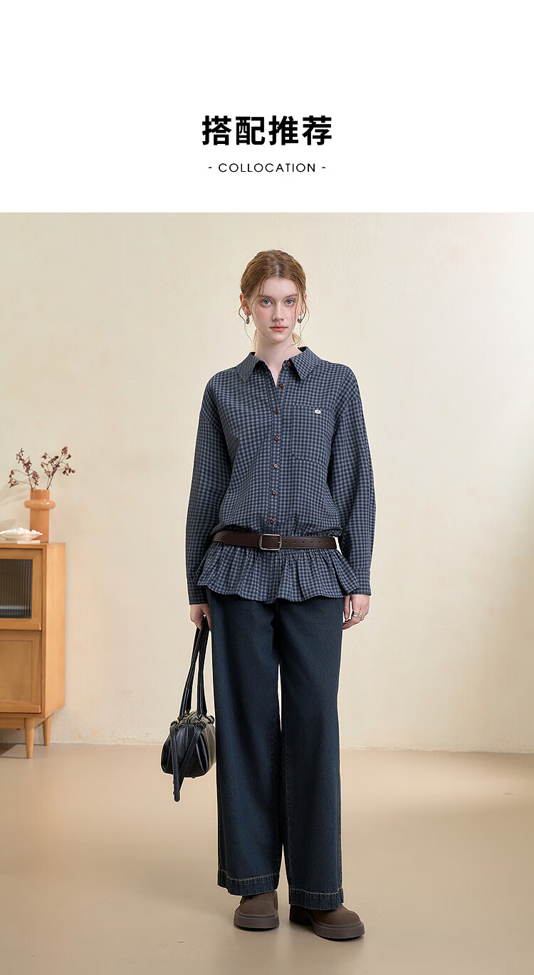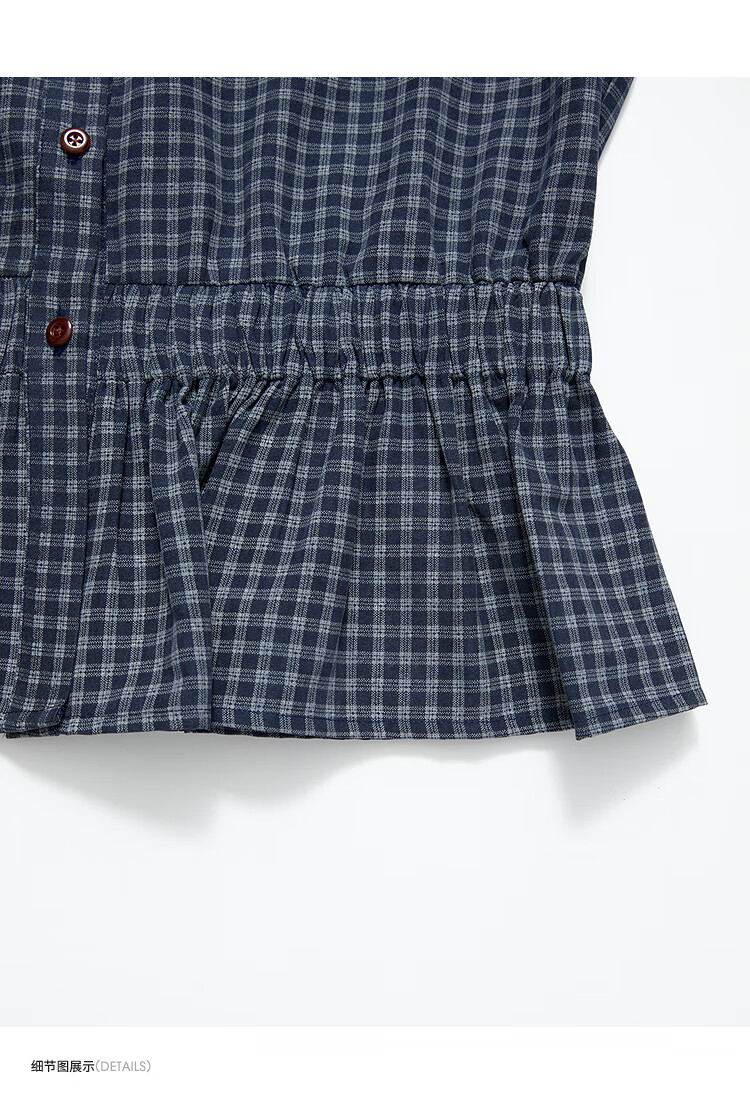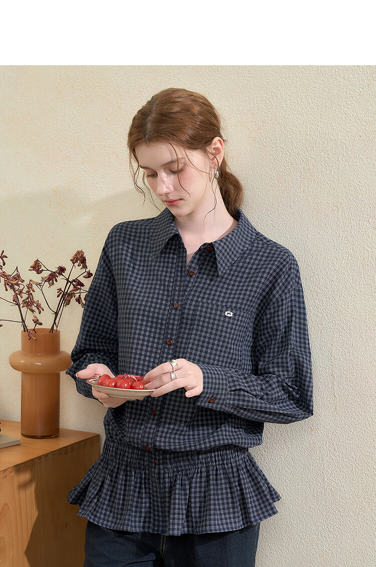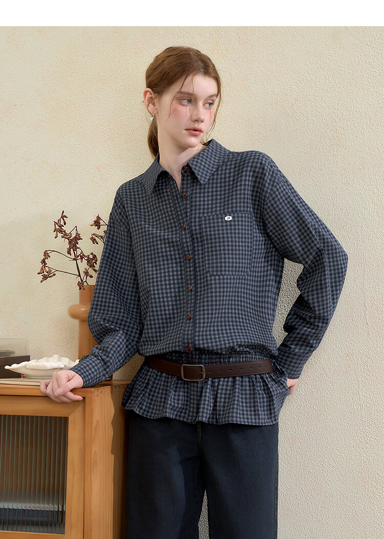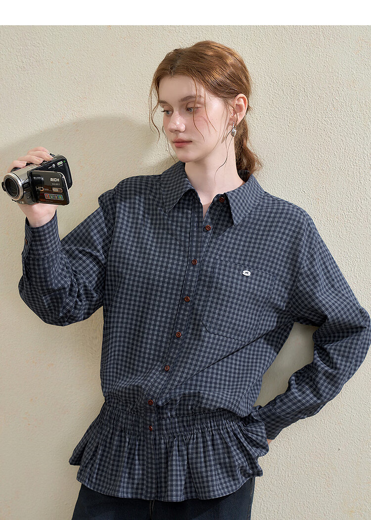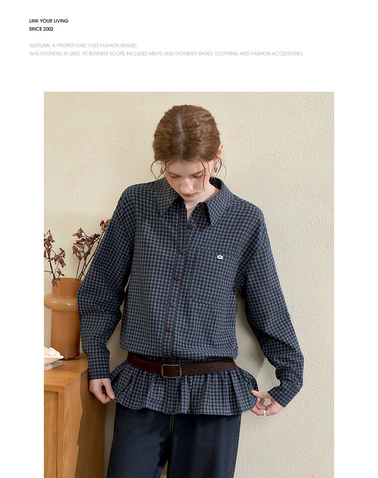 Westlink Retro Blue Plaid Shirt Women's Autumn New Waist Ruffle Design Shirt Jacket Blue M (160)