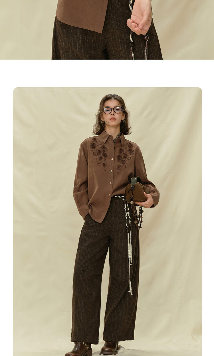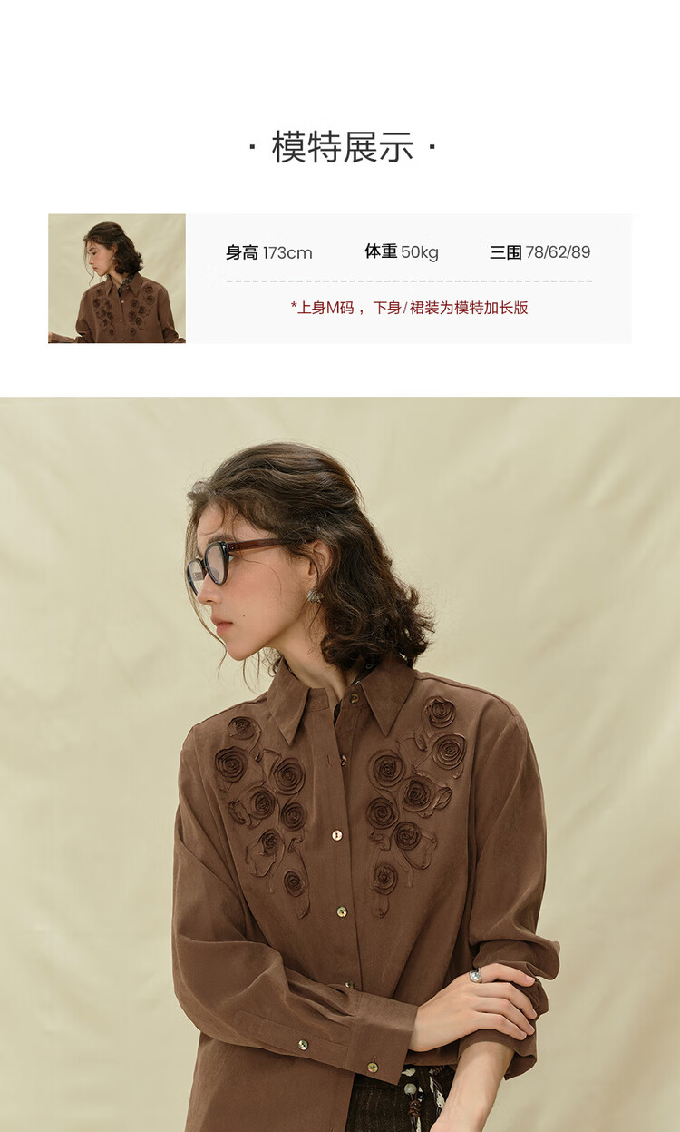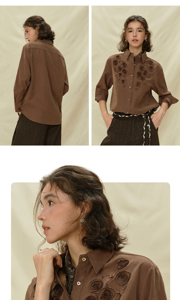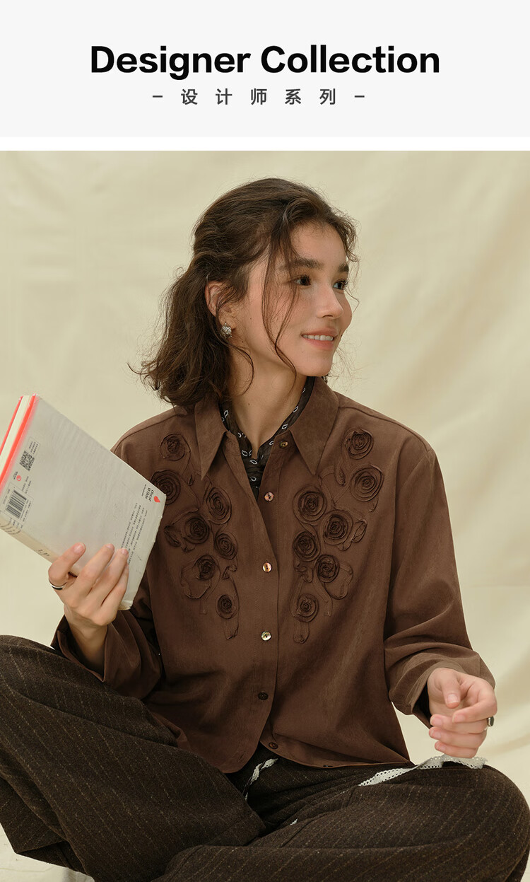 Giordano designer loose shirt autumn and winter new three-dimensional floral suede long-sleeved casual shirt 18345521 08 retro brown S