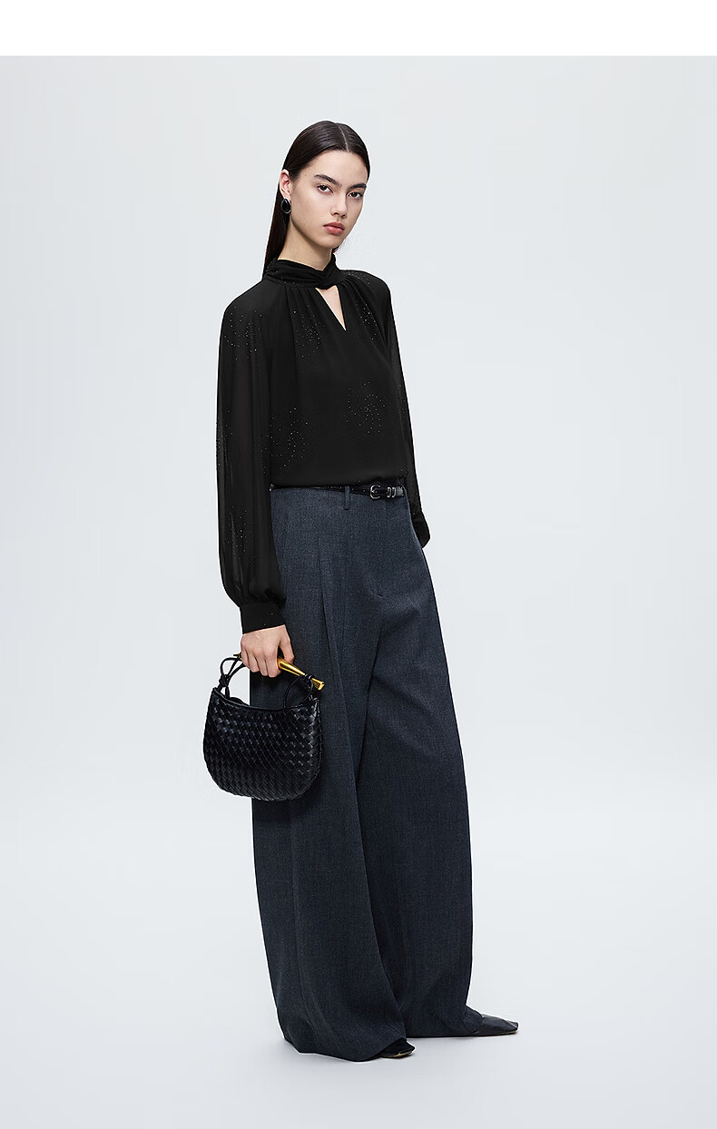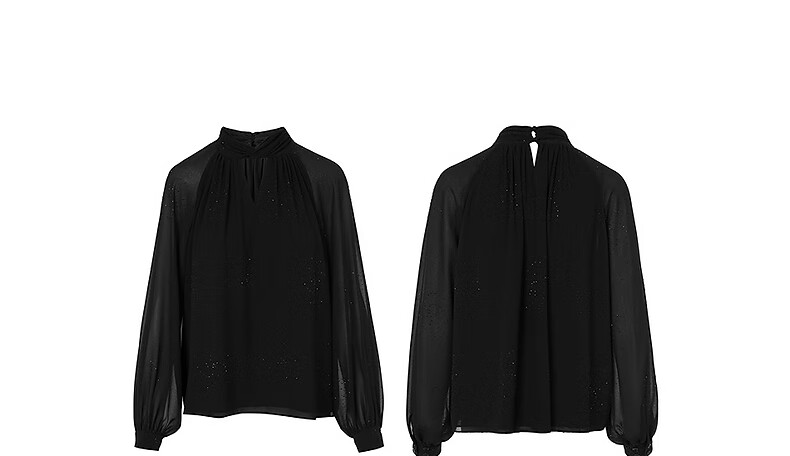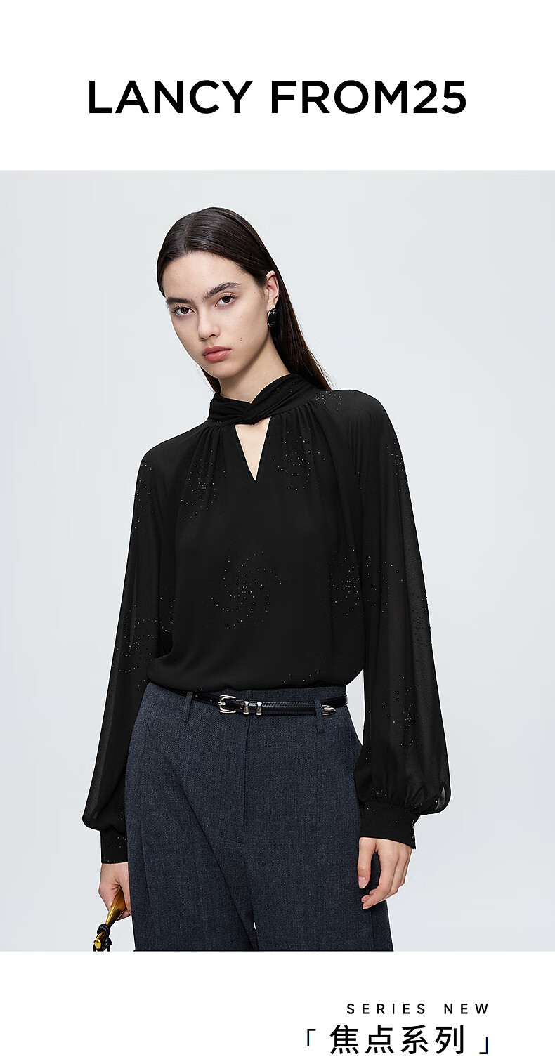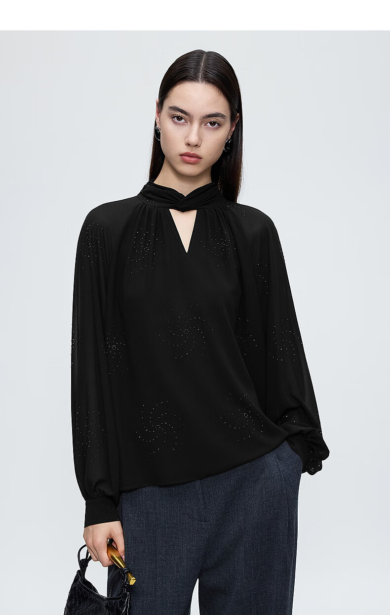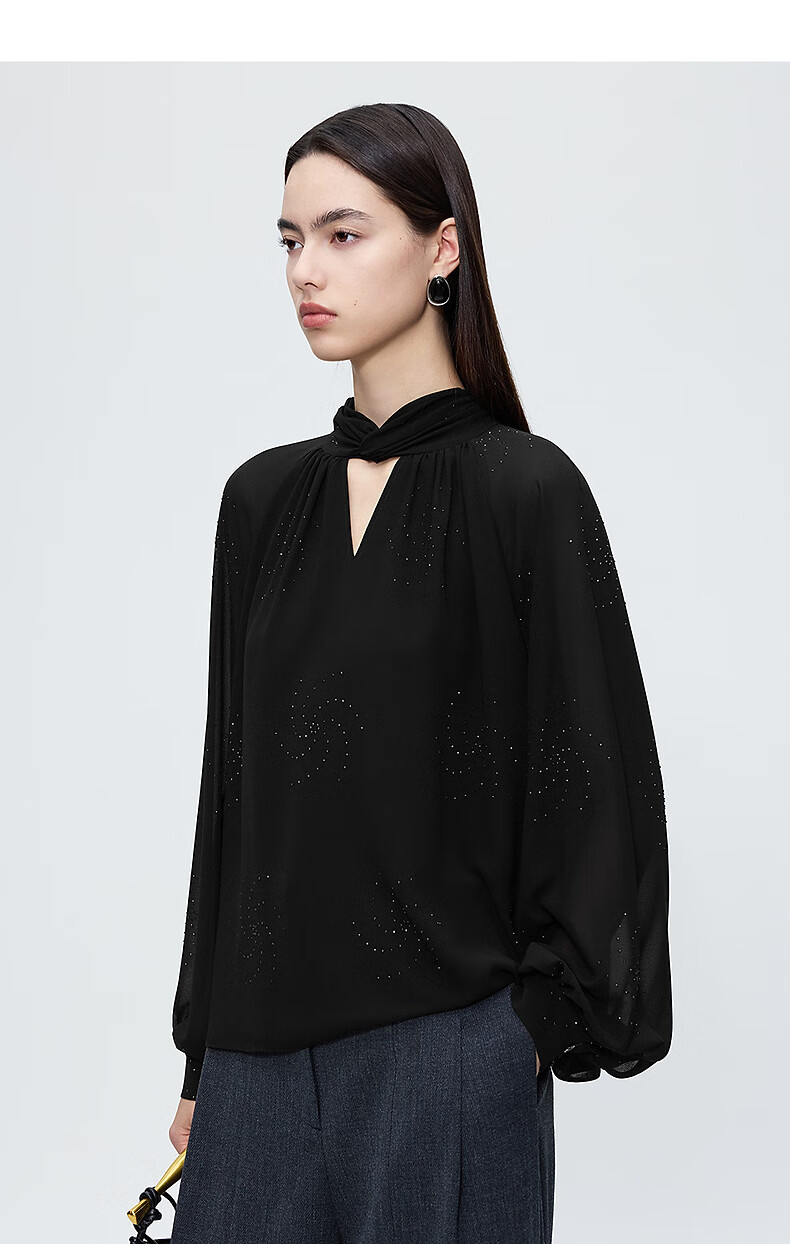 Langzi Design Fashion Hollow Stand Collar Top Lantern Sleeve Black Shirt 2025 Winter New Style Black 2 S
