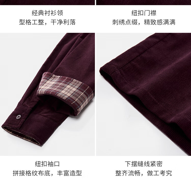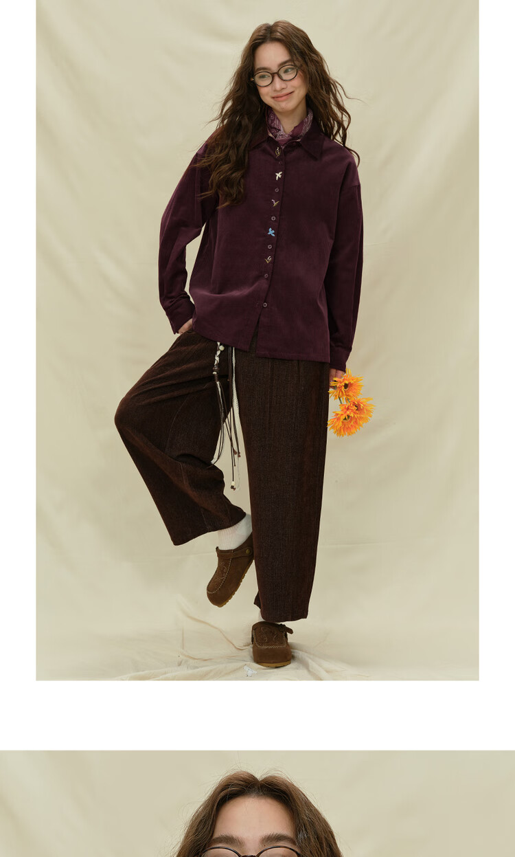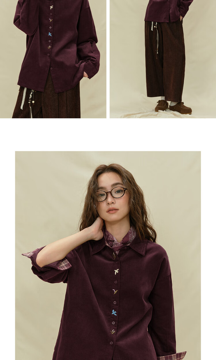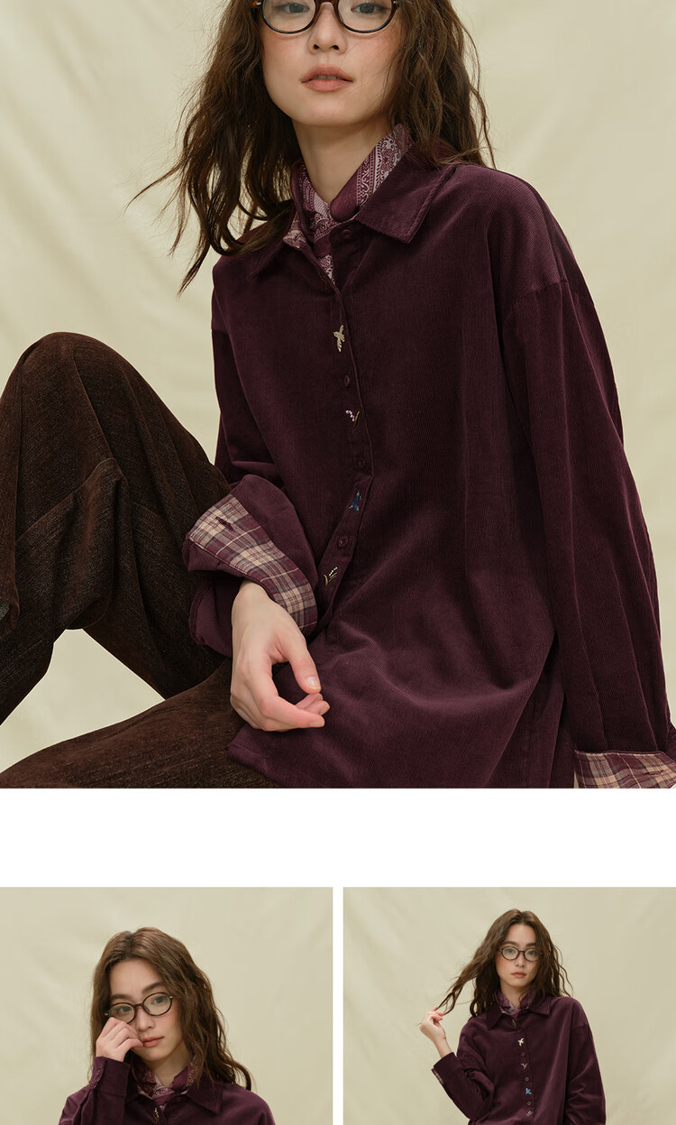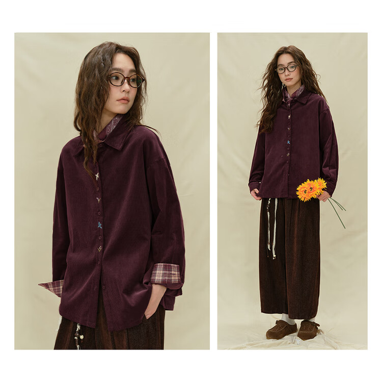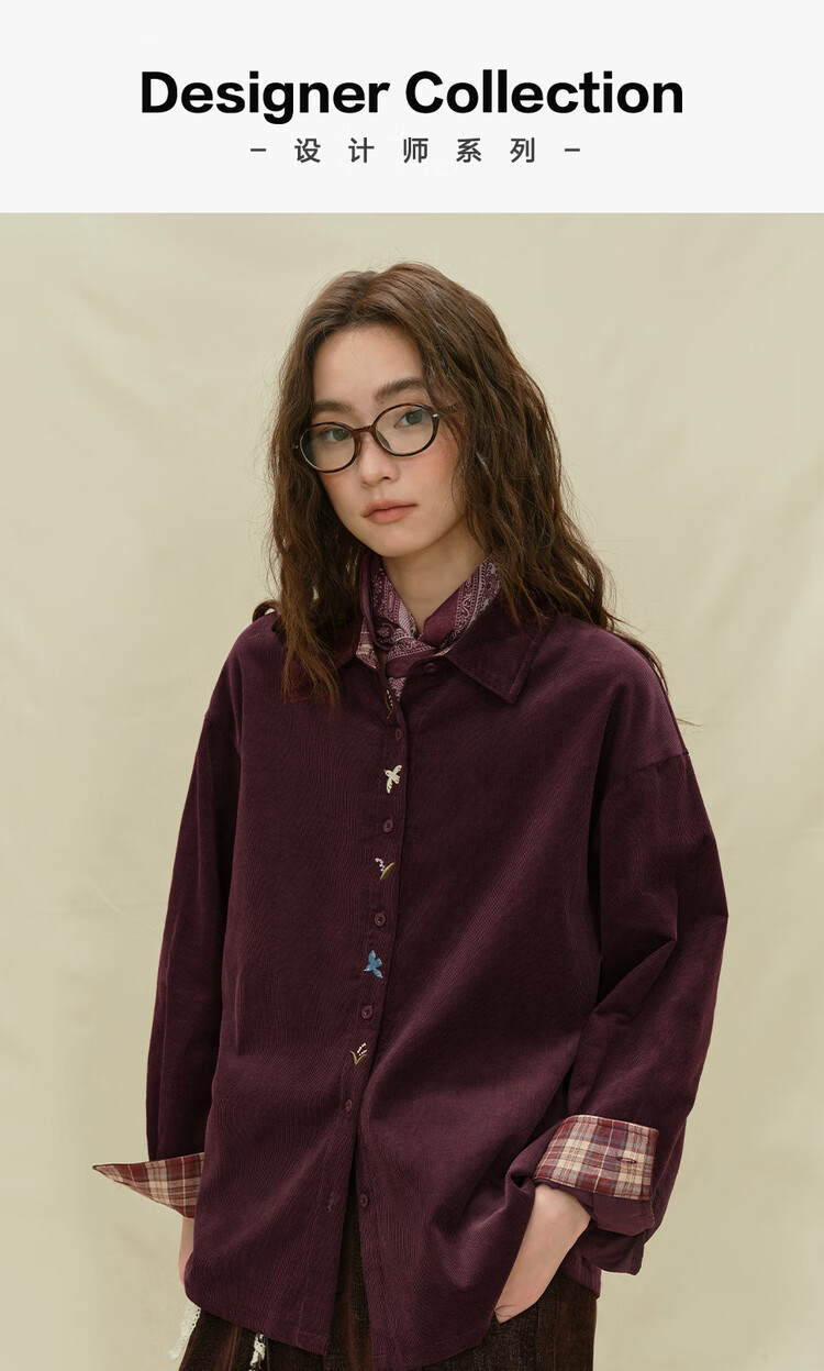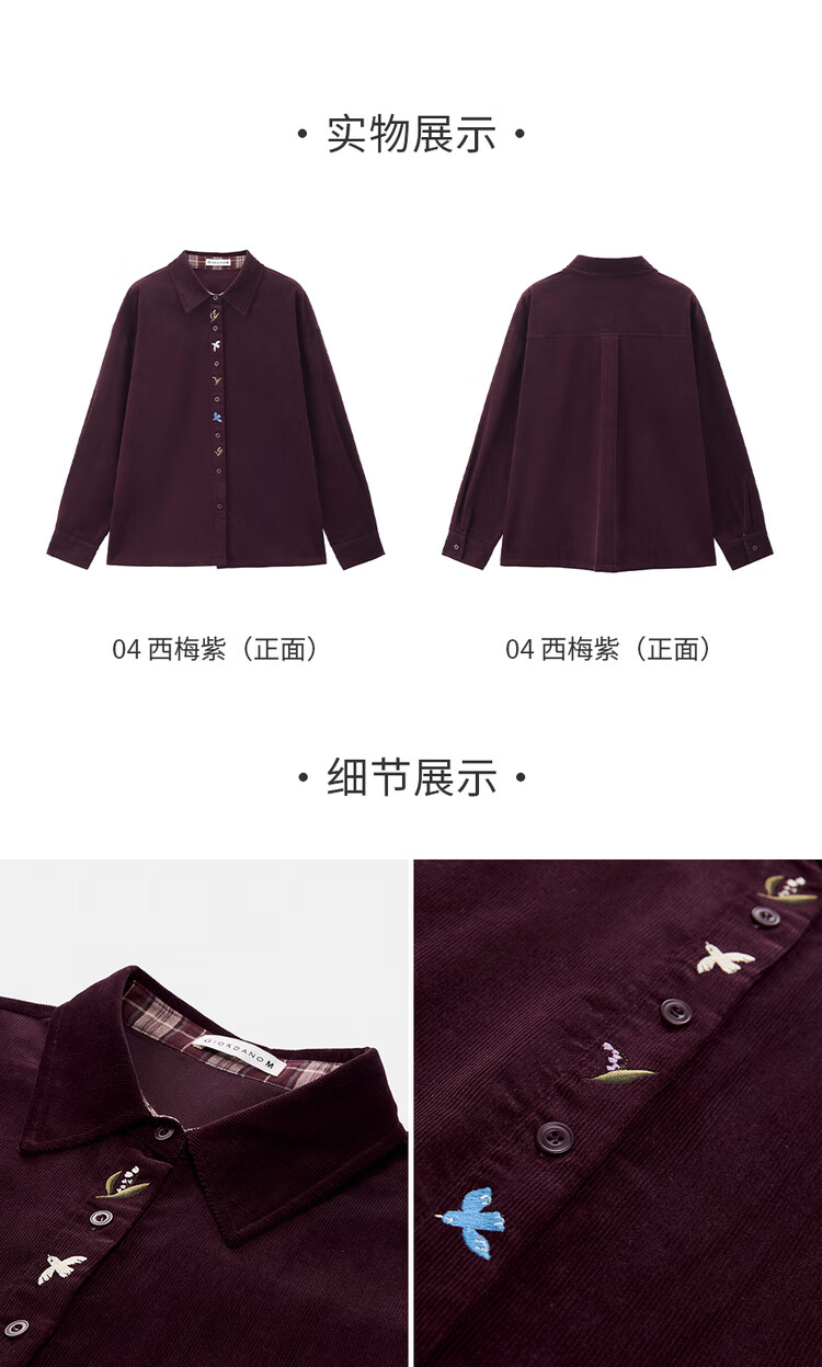 Giordano designer women's pure cotton corduroy embroidered plaid loose long-sleeved shirt 18345227 04 prune purple M