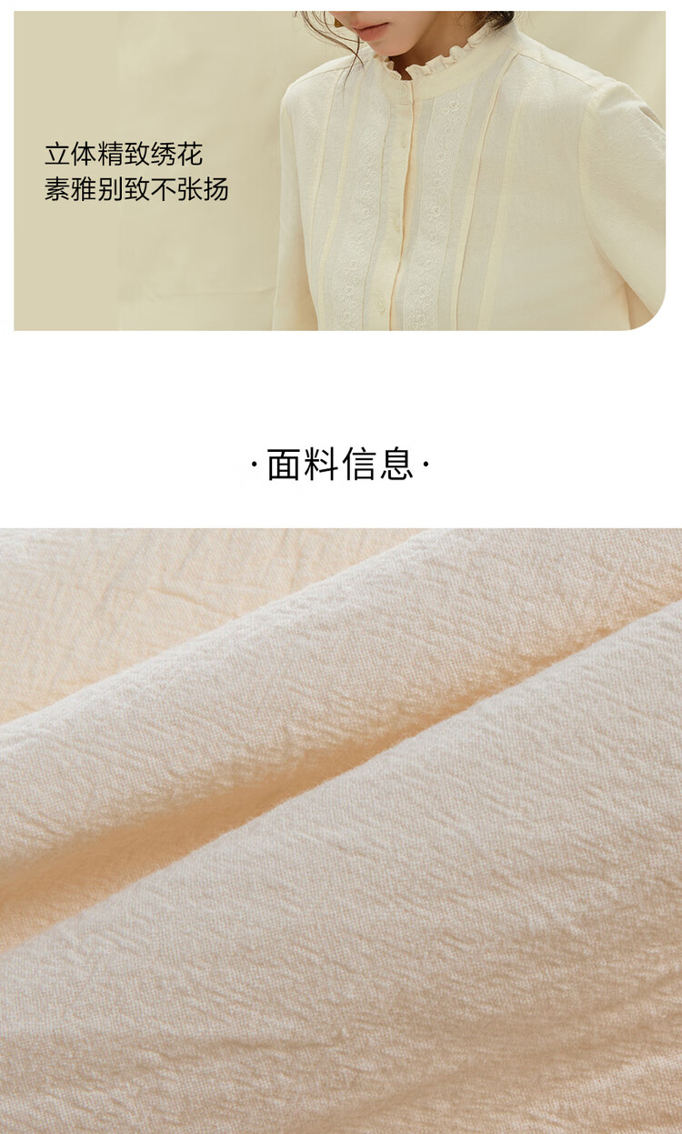 Giordano designer pleated texture cotton embroidered lace stand collar loose long-sleeved shirt for women 18345706 01 glutinous rice white M