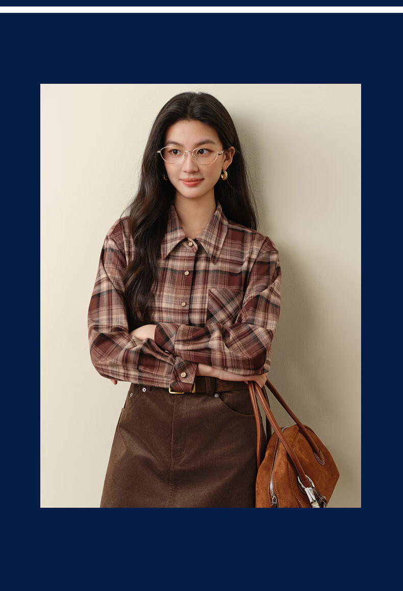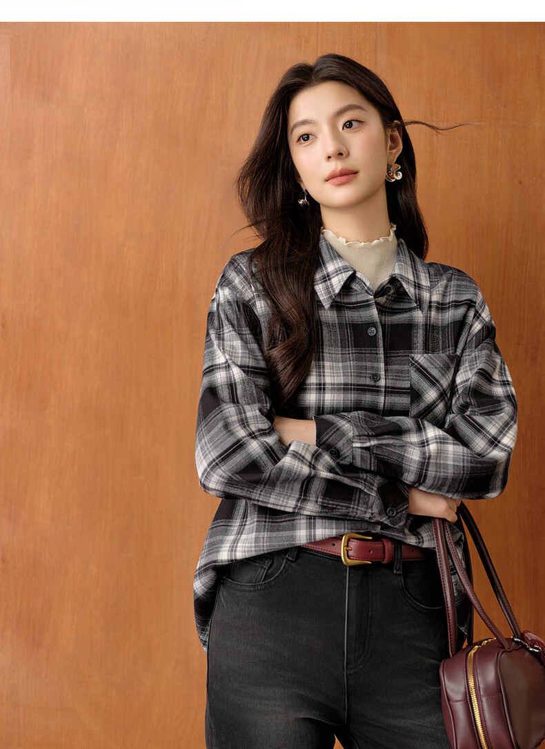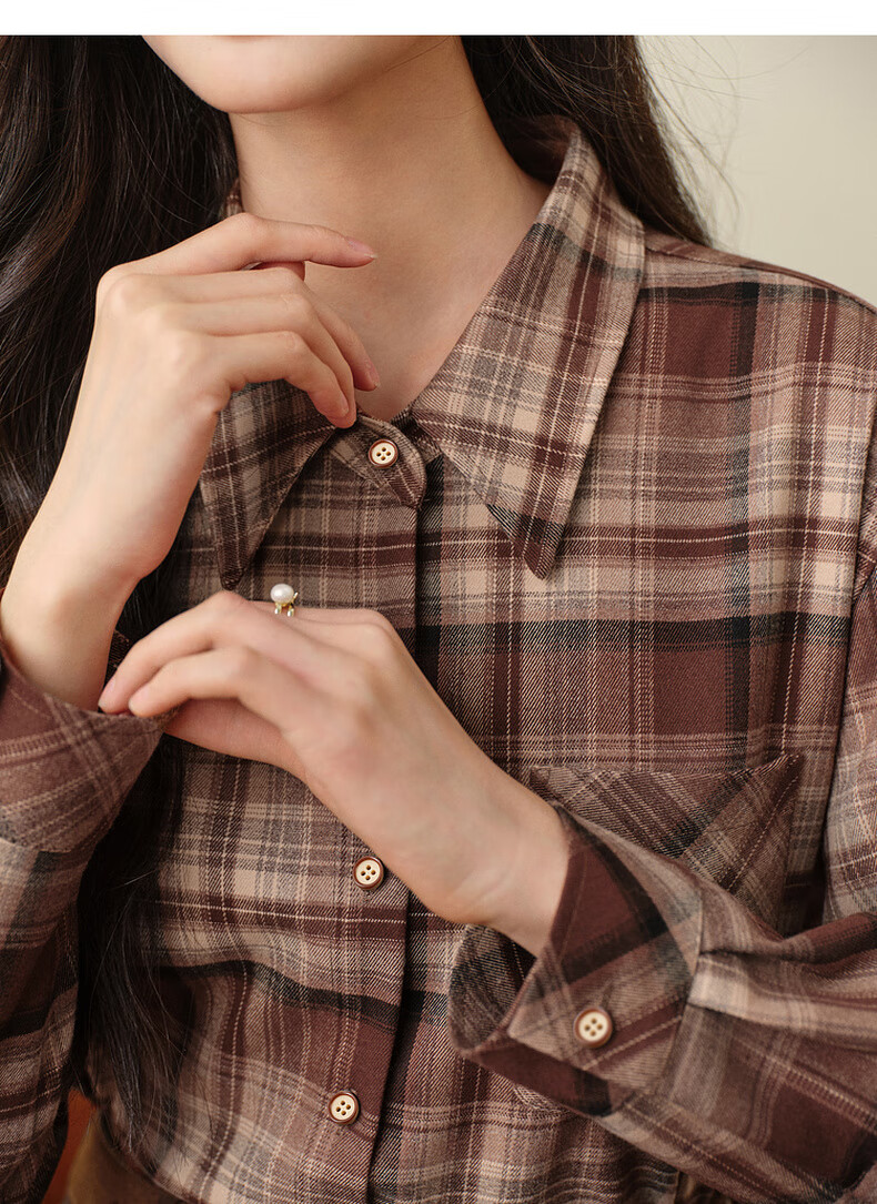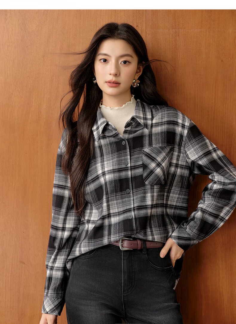 SEIFINI Hong Kong style retro commuter shirt 2025 autumn and winter new contrast color plaid long-sleeved temperament lapel top for women black M