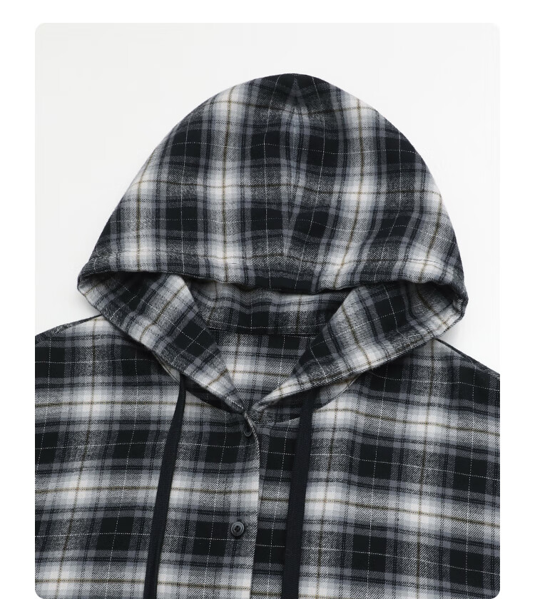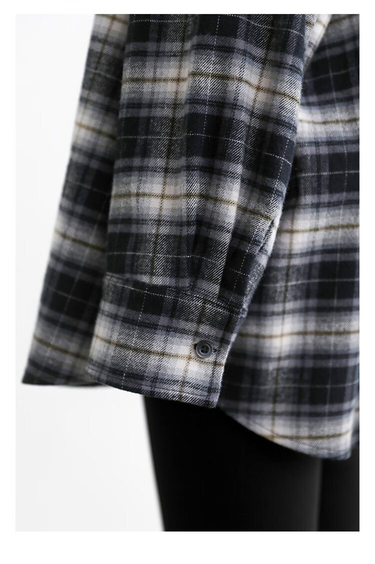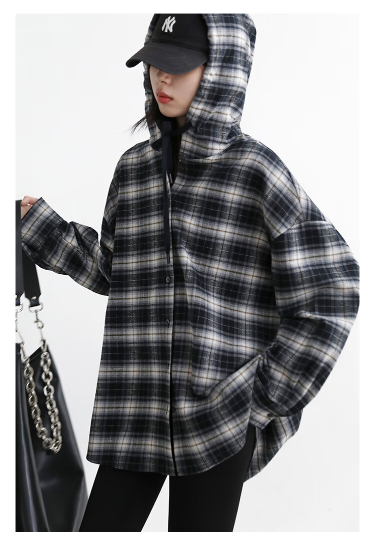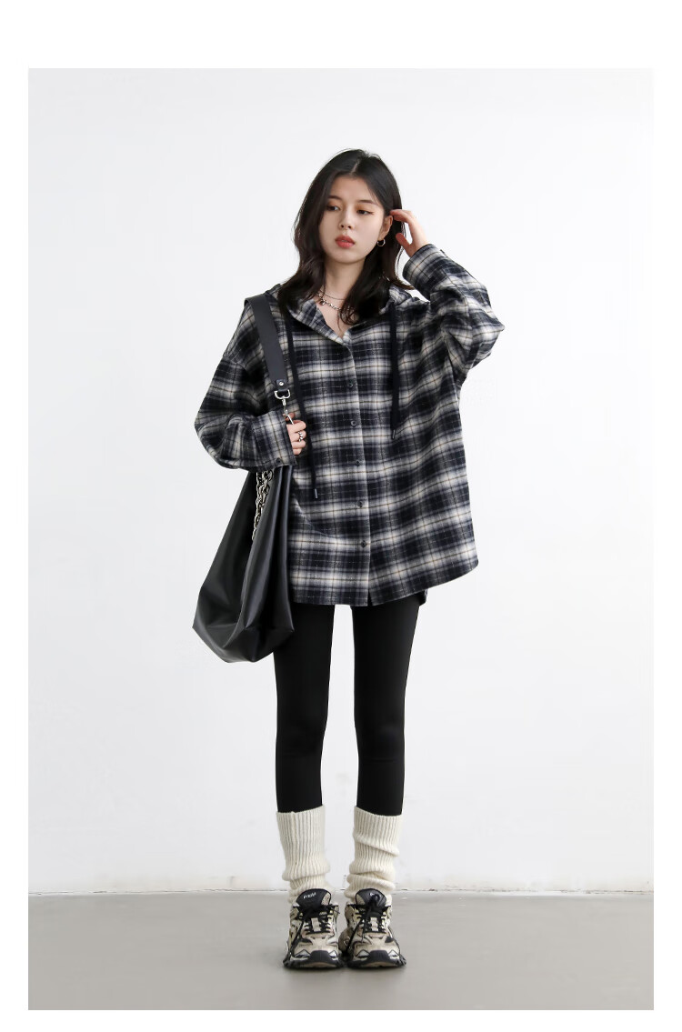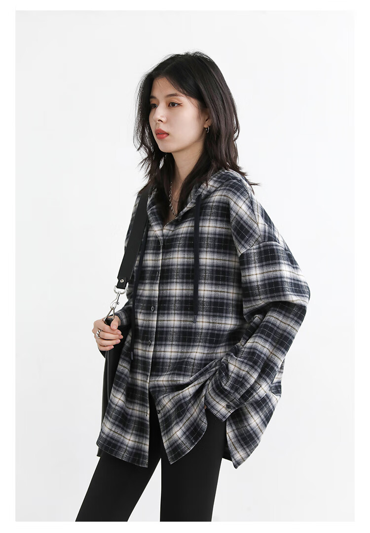 CHIC VEN 2025 Autumn and Winter Cotton Brushed Feel Versatile Hooded Plaid Shirt Lazy Feeling Long Sleeve Shirt Women chicven navy plaid S (43-58kg)