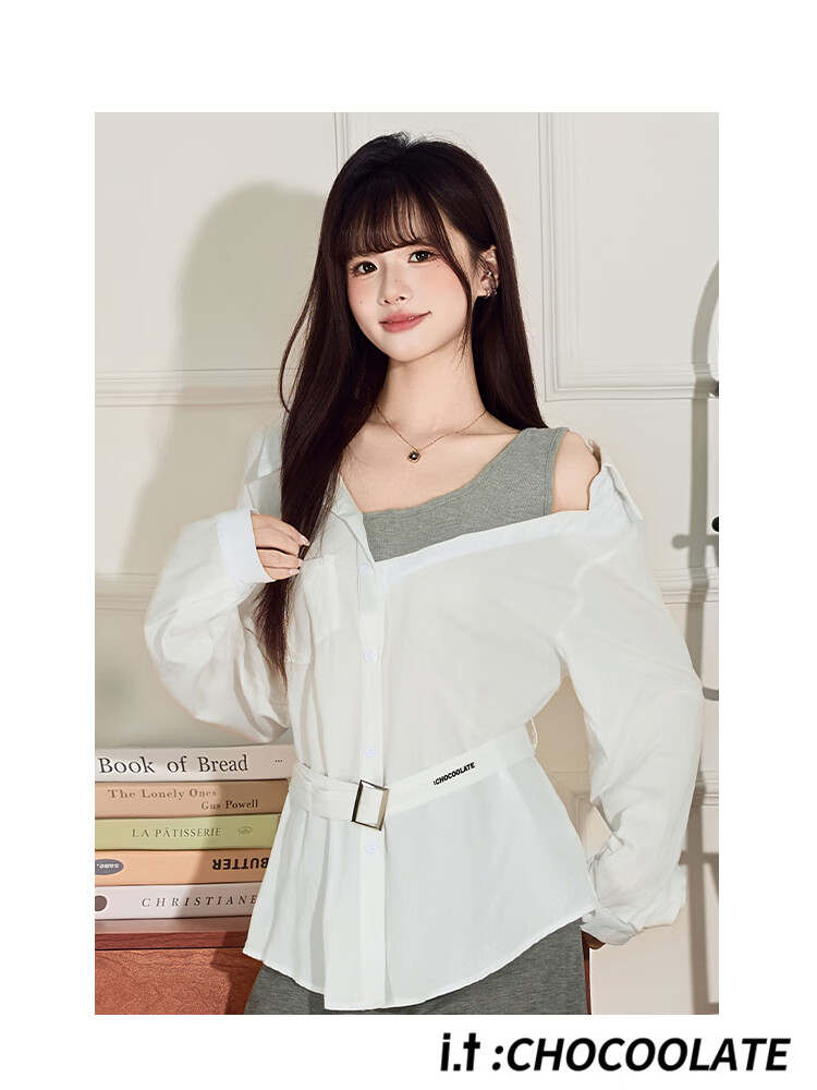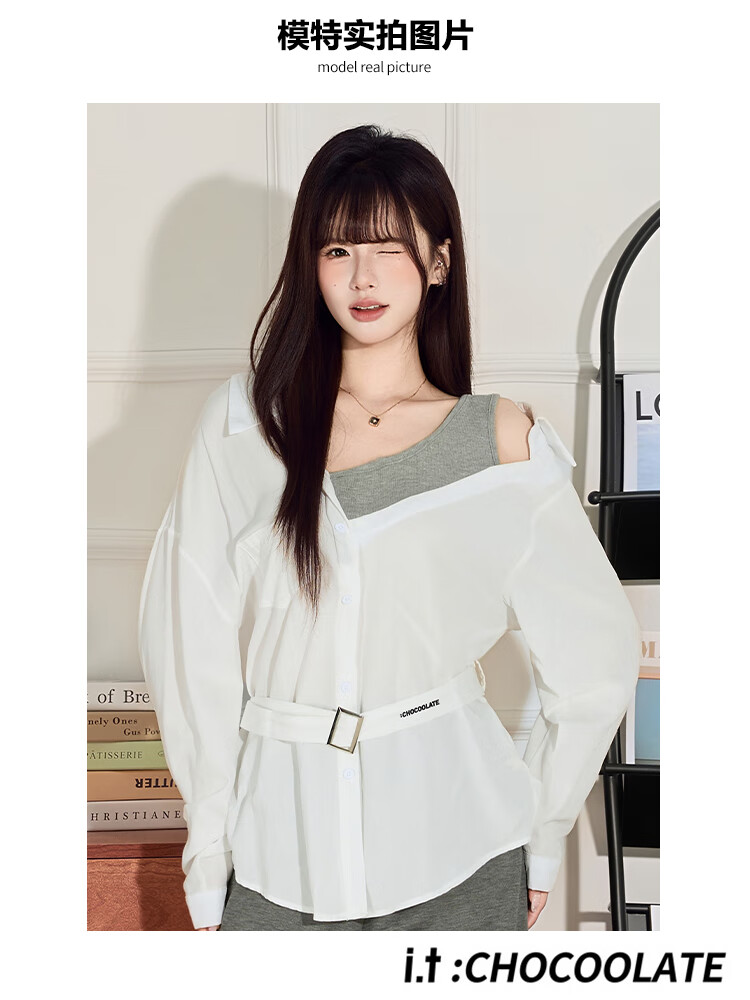 CHOCOOLATE it women's sexy design off-shoulder fake two-piece splicing long-sleeved shirt for women autumn and winter slim waist top for women white M