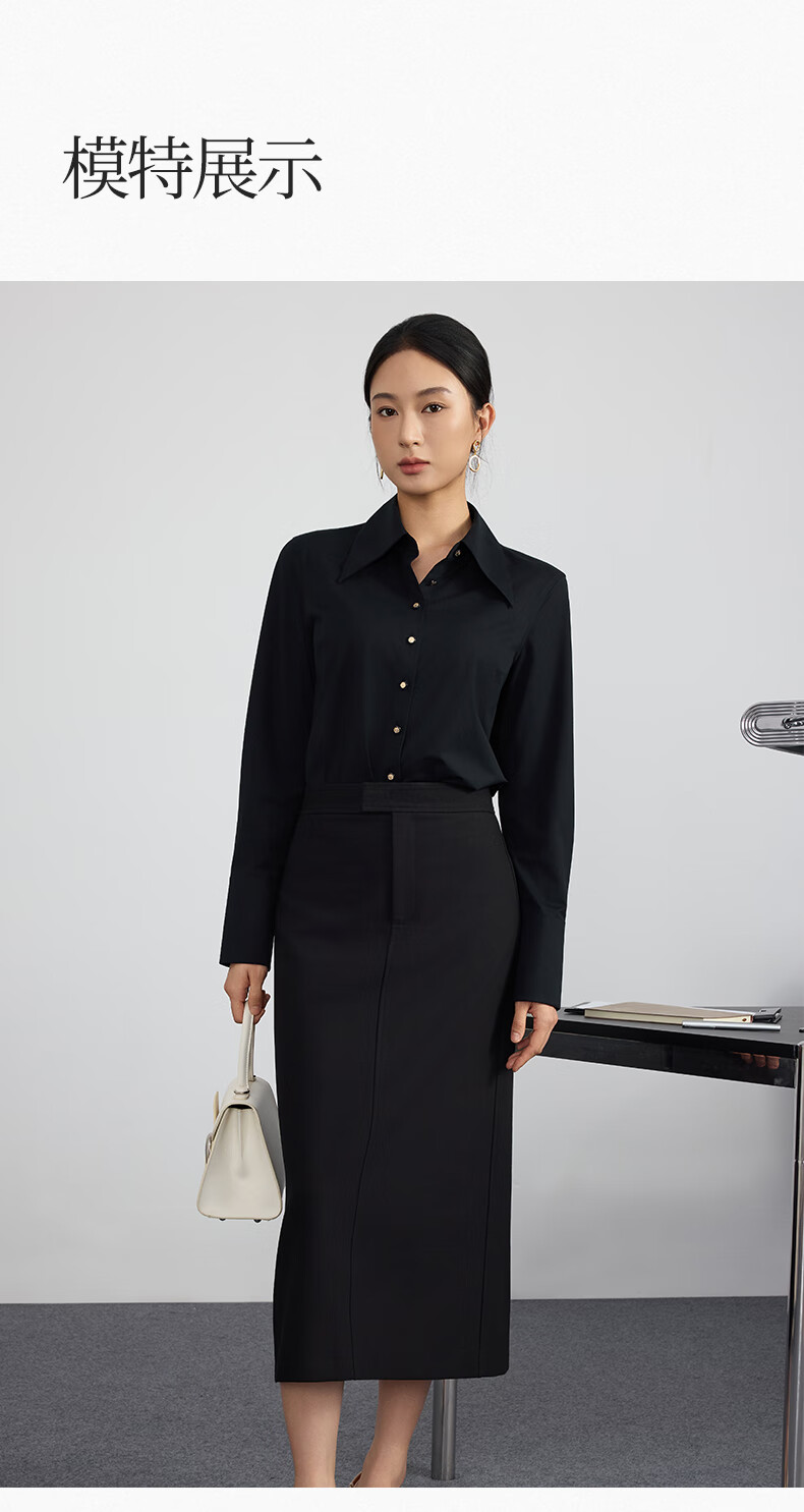 DEGRE ZERO Women's Long Sleeve Shirt Slim Fit Large Peak Collar Solid Color Commuting Fashion Shirt Stretch 2025 Autumn Black Large Peak Collar Gold Edge Pearl Button L (165/88A)