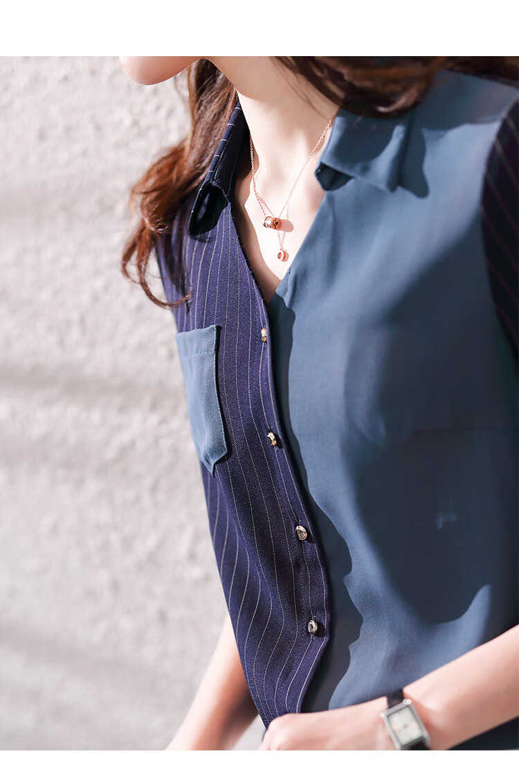 Demana (dme) spring fashion splicing casual women's shirt slim H-shaped women's top V-neck temperament shirt for women Navy S