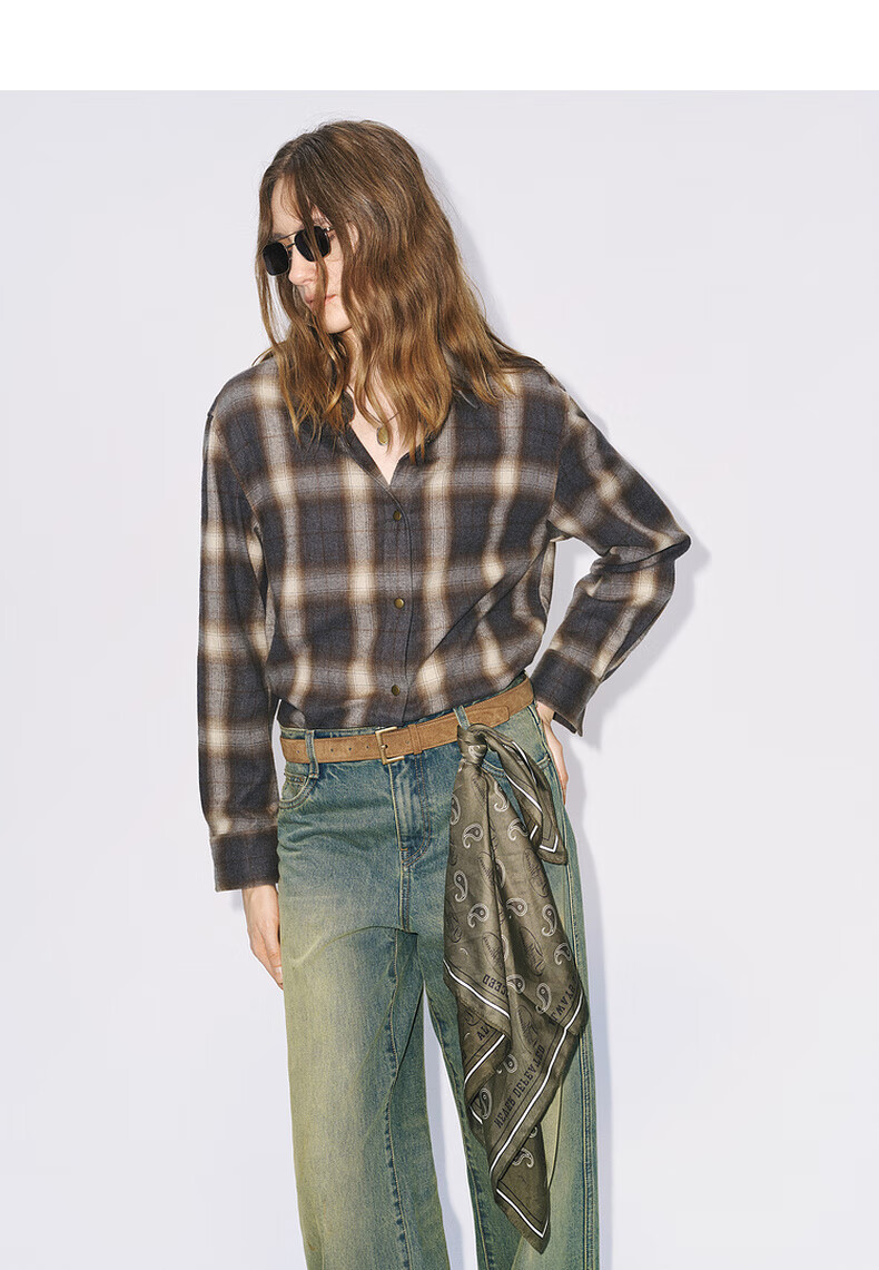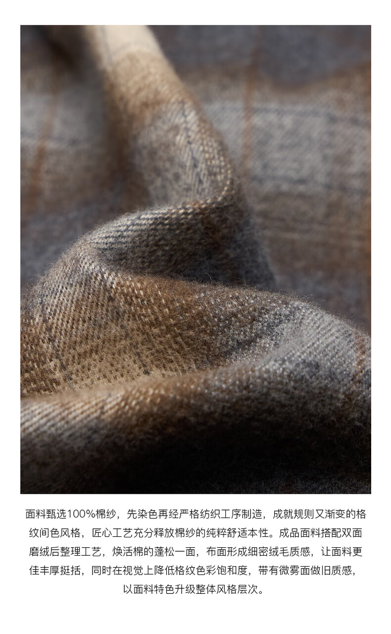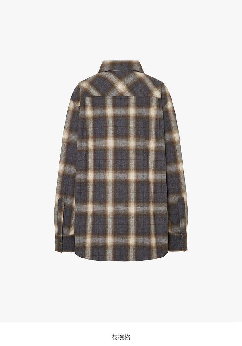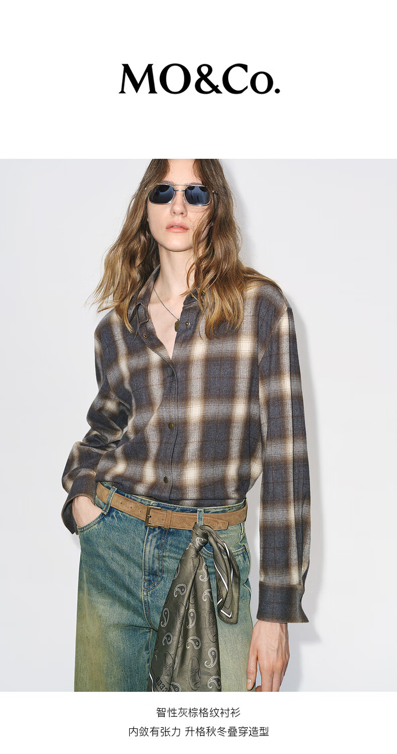 MO&Co. Shirt 2025 Winter New Product Double-sided Brushed Thick Cotton Gradient Plaid Matte Old Feel Unisex MBE4SHT003 Gray Brown Plaid S /160
