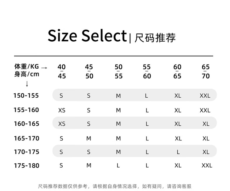 China (cm) 160-165/84-86 165-170 / 88-90 167-172 / 92-96 168-173 / 98-102 170-176 / 106-110