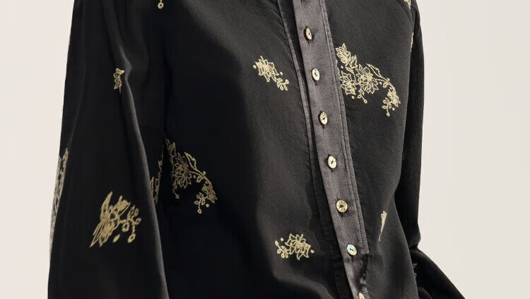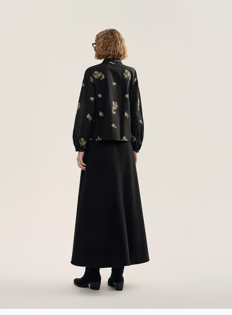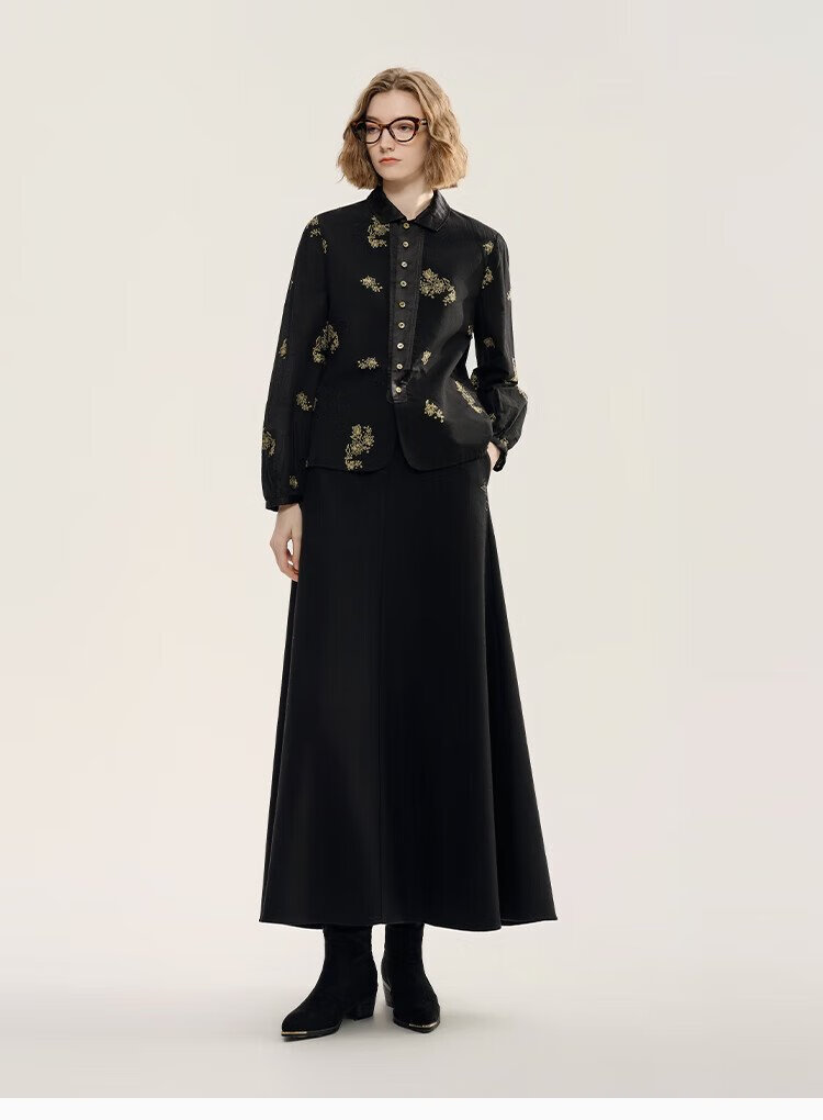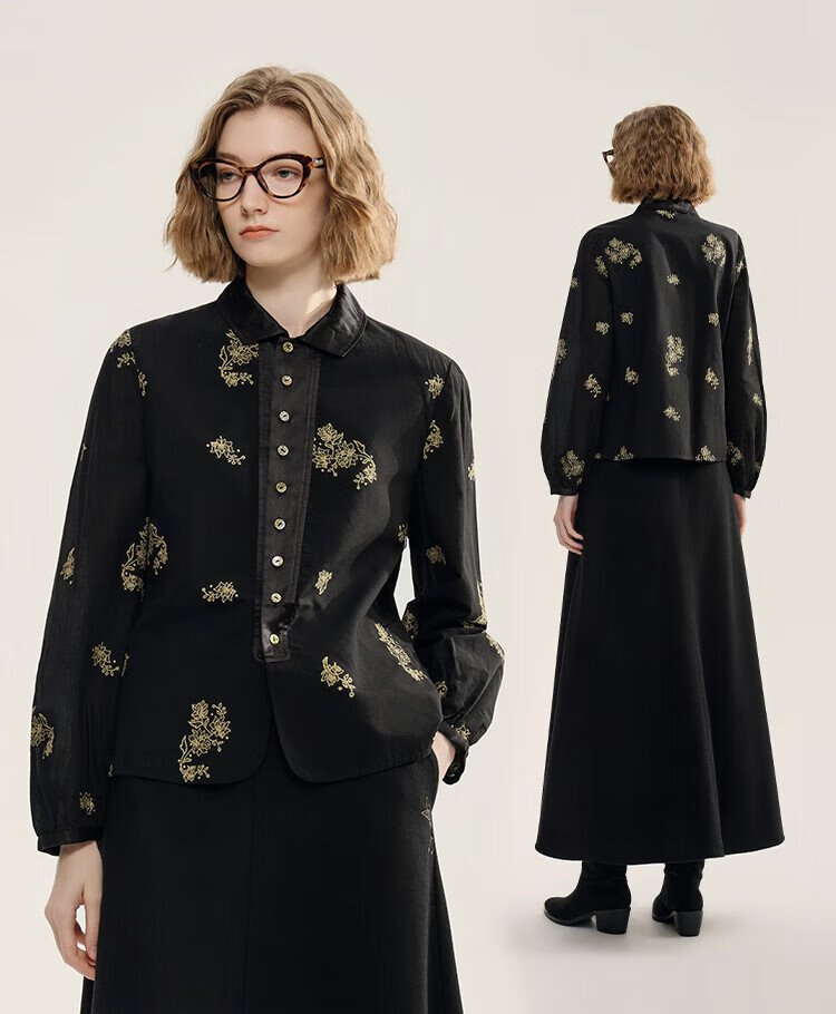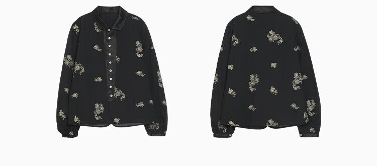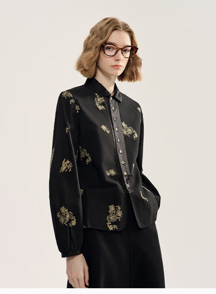 EIN Yan retro style three-dimensional cut-out contrast material splicing lapel literary casual long-sleeved shirt 2025 autumn and winter new style graphite black S