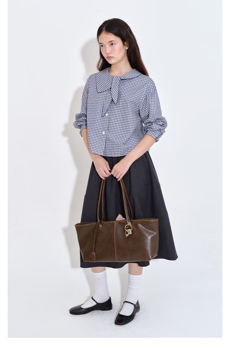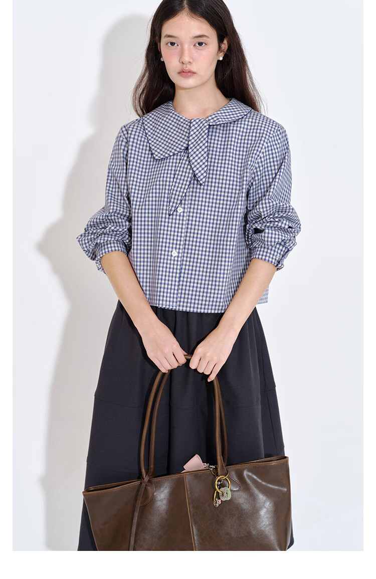 Fano studios Fan Luo Fano niche design rabbit ear collar heavy industry curved tooth craft plaid short shirt women's top autumn blue plaid ready-made S