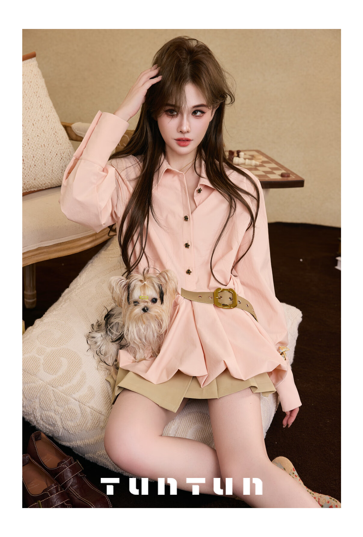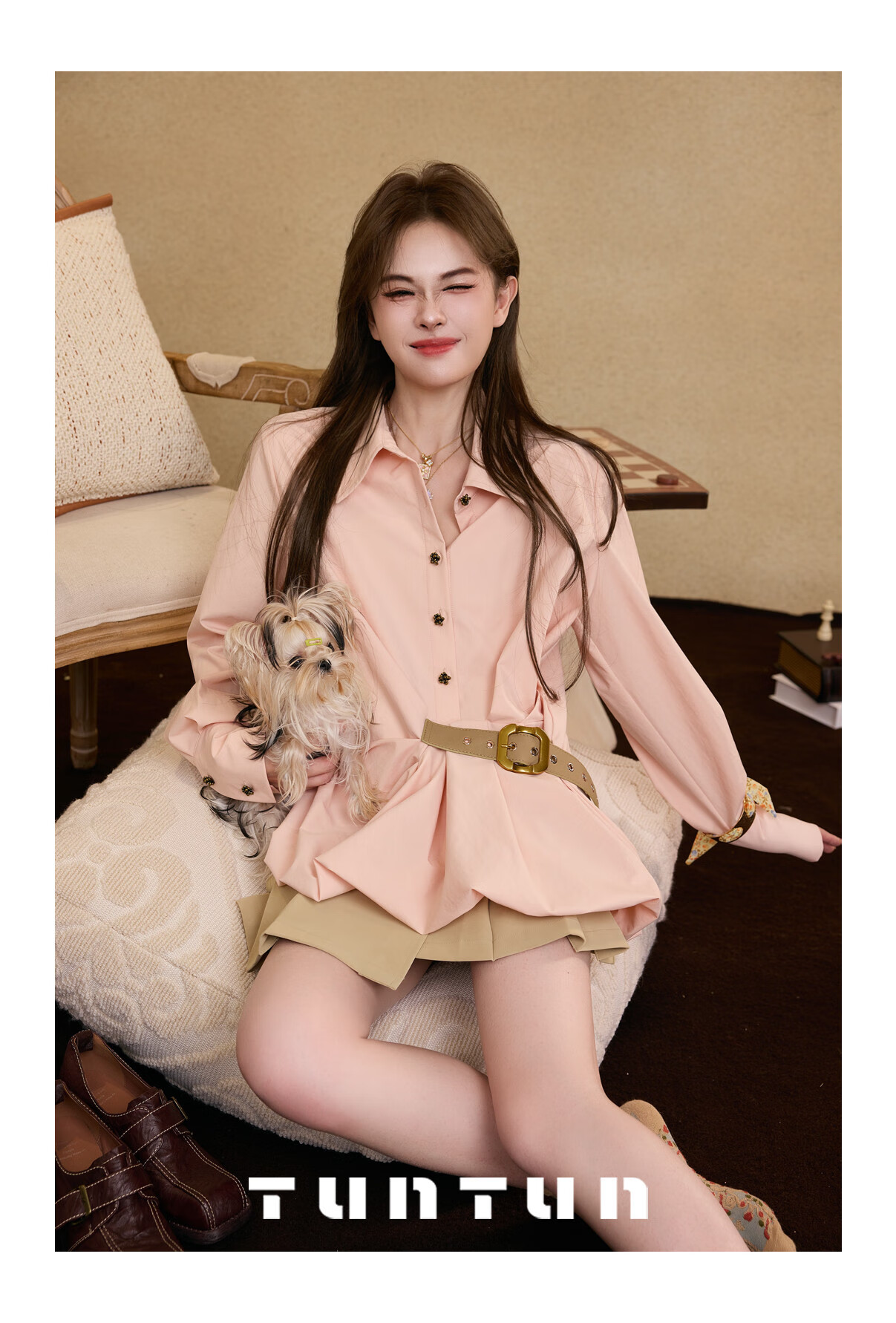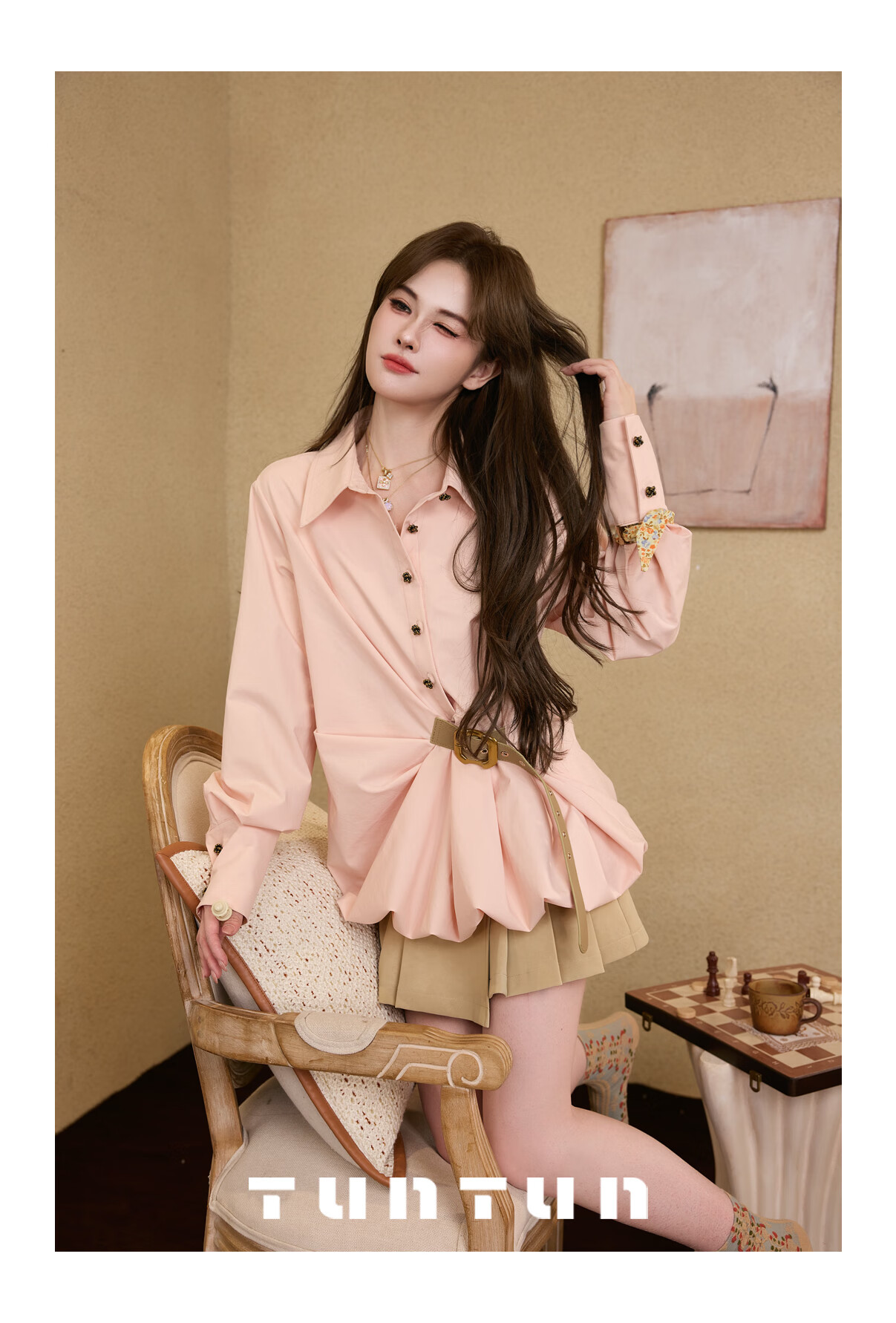 TUNTUN Autumn and Winter foldout, very recognizable, personalized pleated belt waist-cinching pink long-sleeved shirt top, rubber powder in stock S