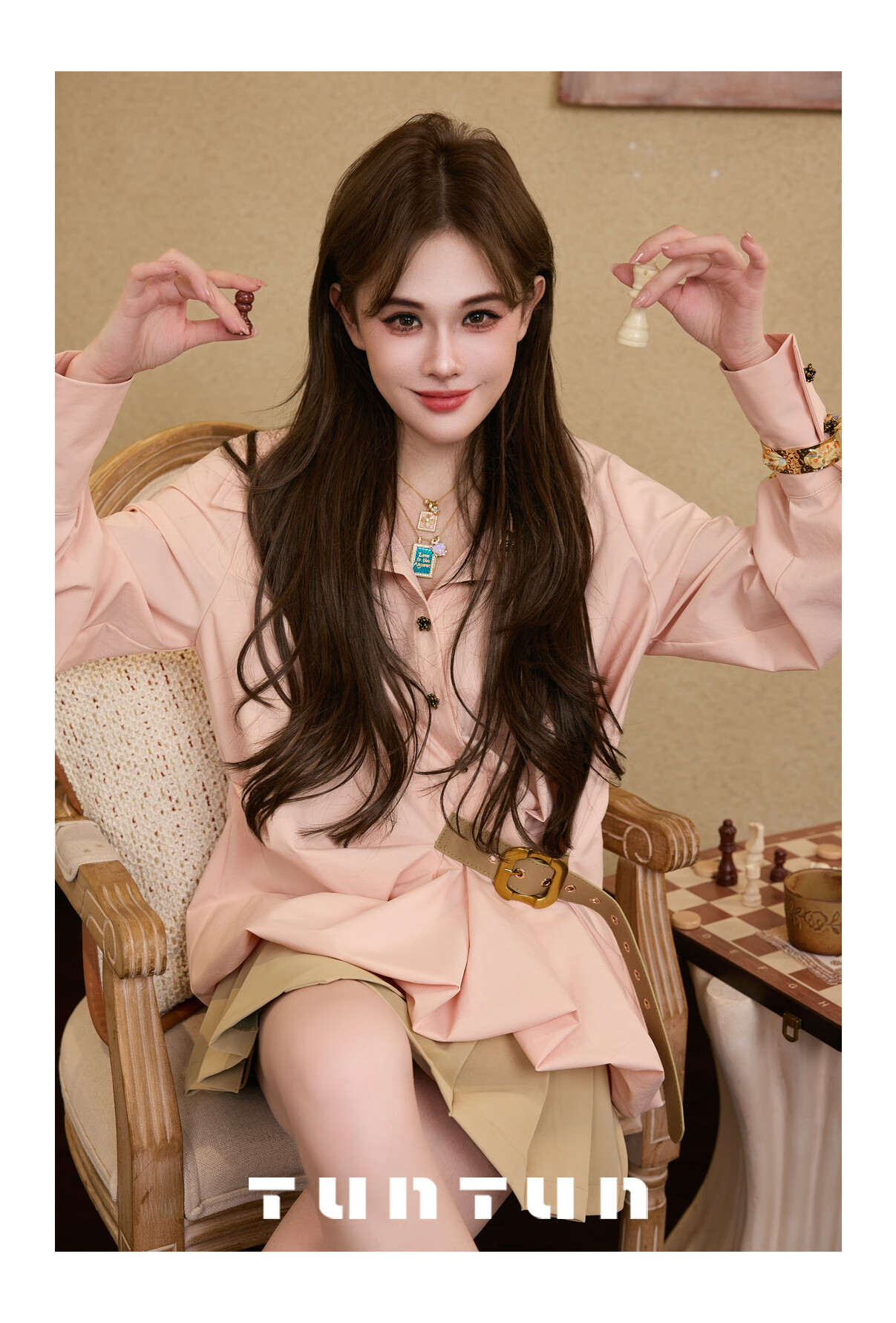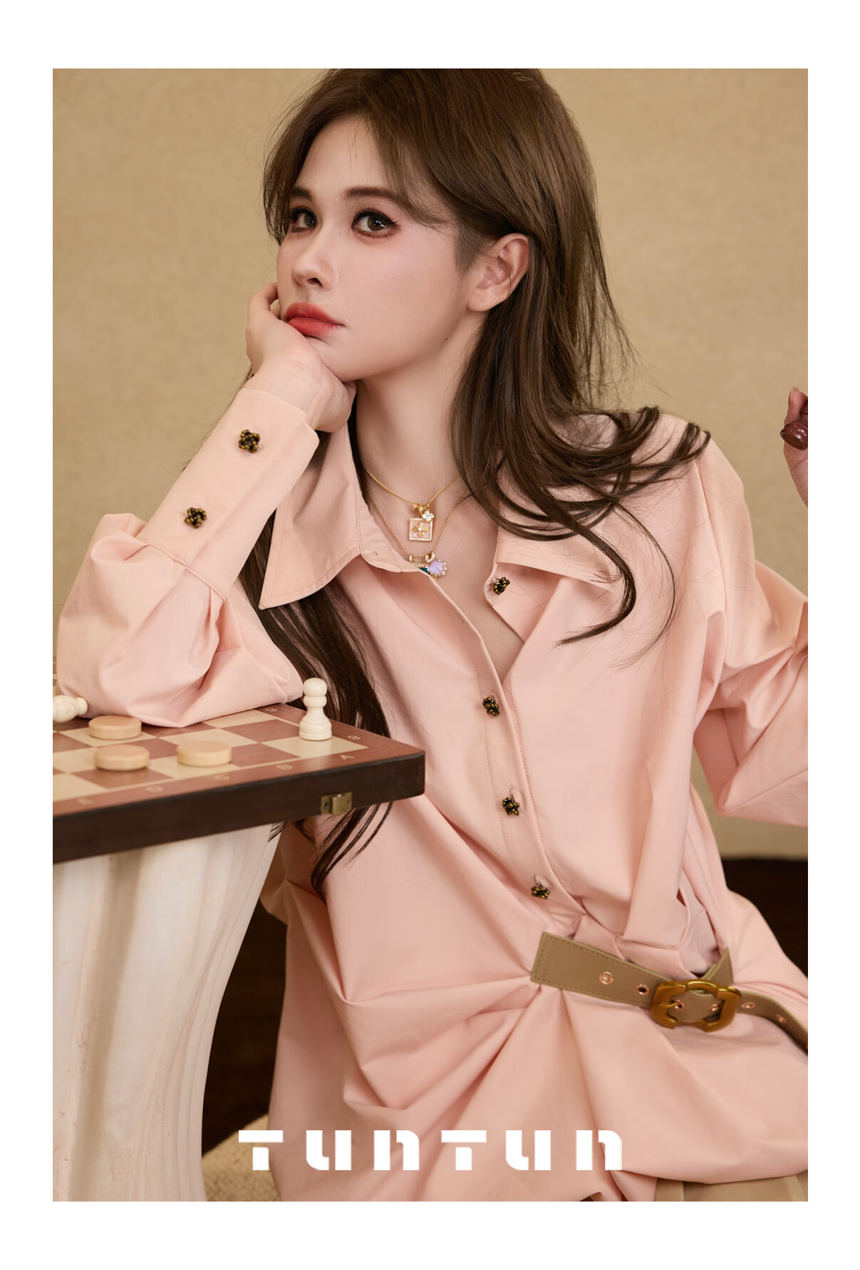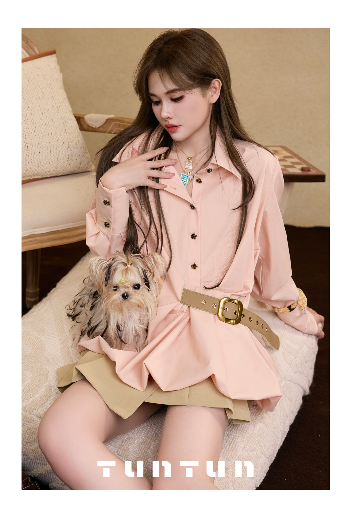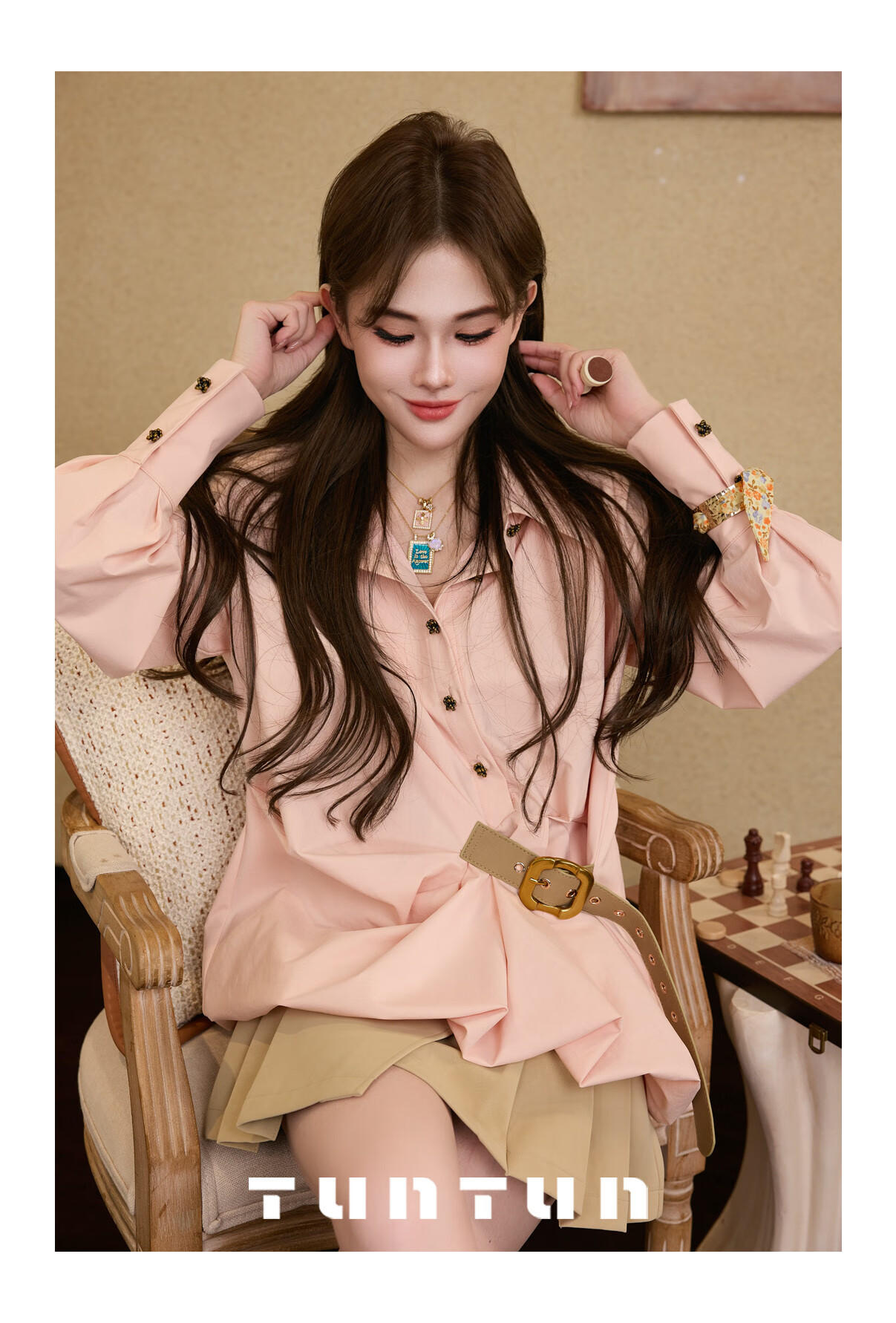 TUNTUN Autumn and Winter foldout, very recognizable, personalized pleated belt waist-cinching pink long-sleeved shirt top, rubber powder in stock S