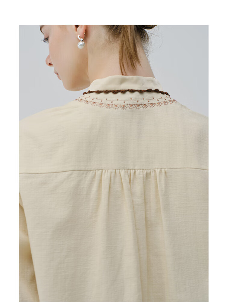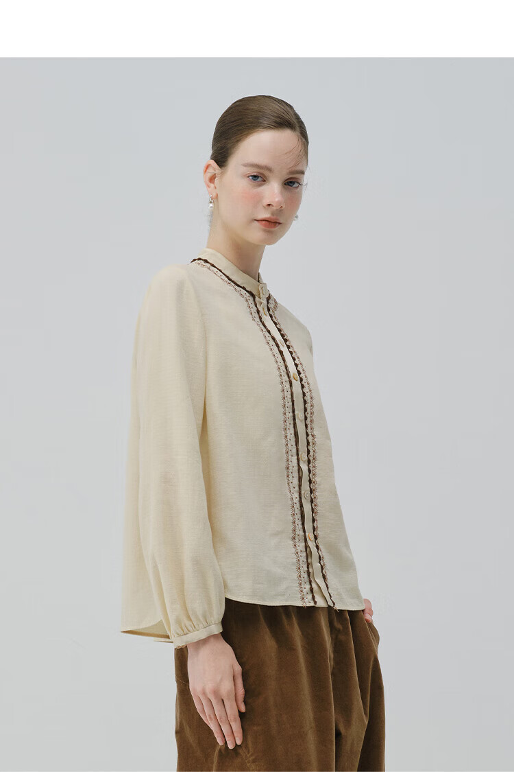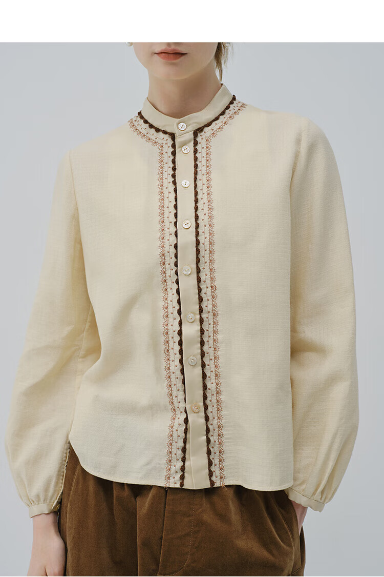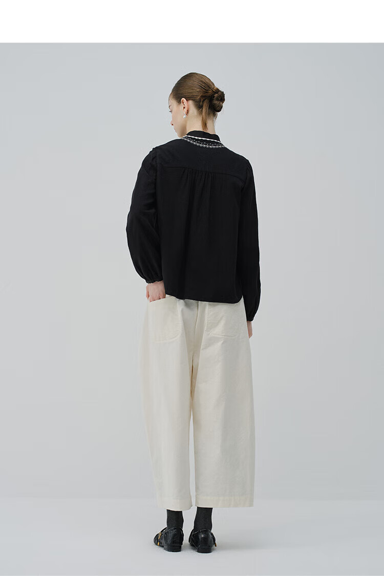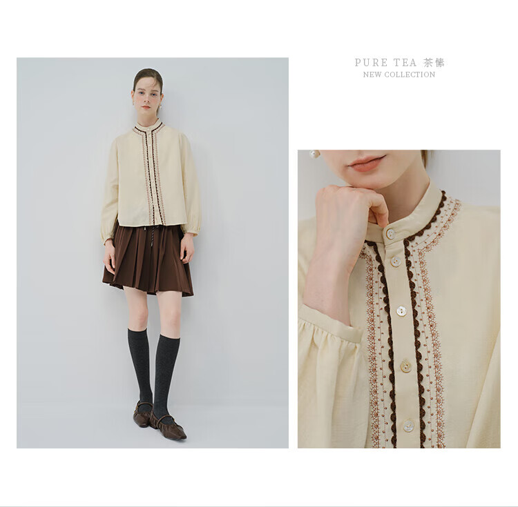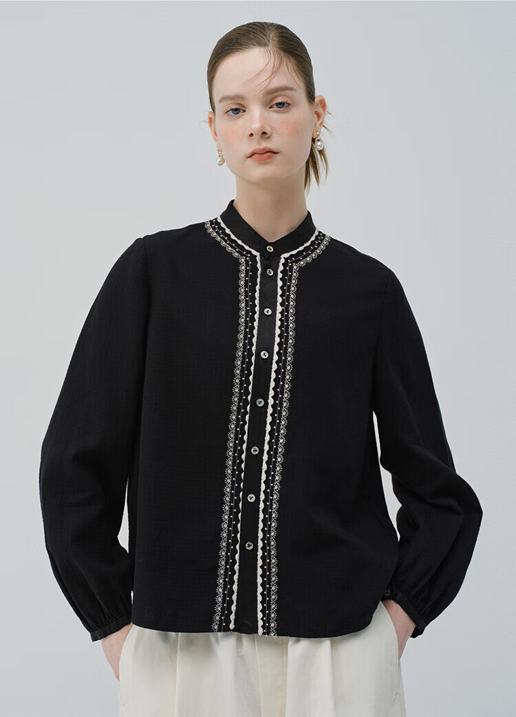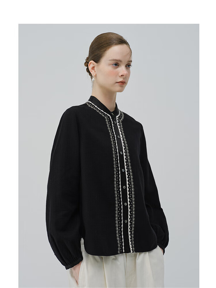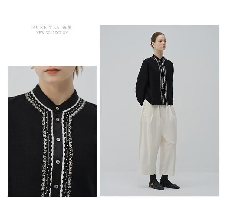 PURE TEA Shopping mall same style puretea tea artistic French stand collar peony flower embroidered shirt for women 2025 winter new graphite black S