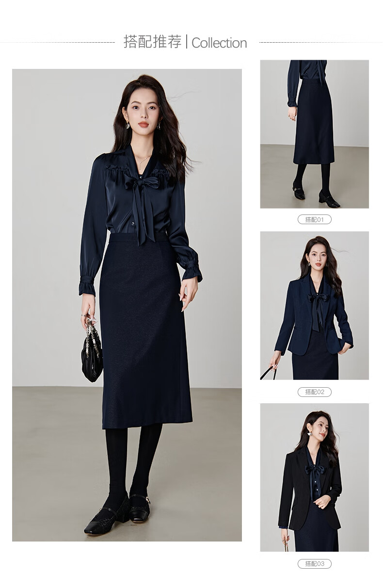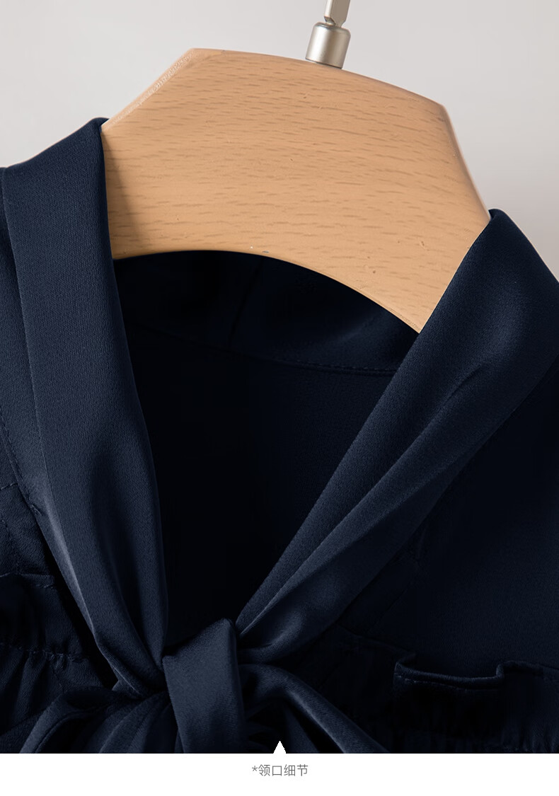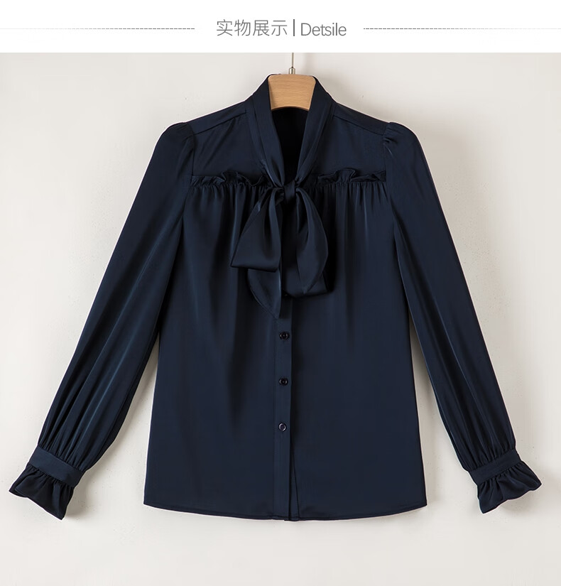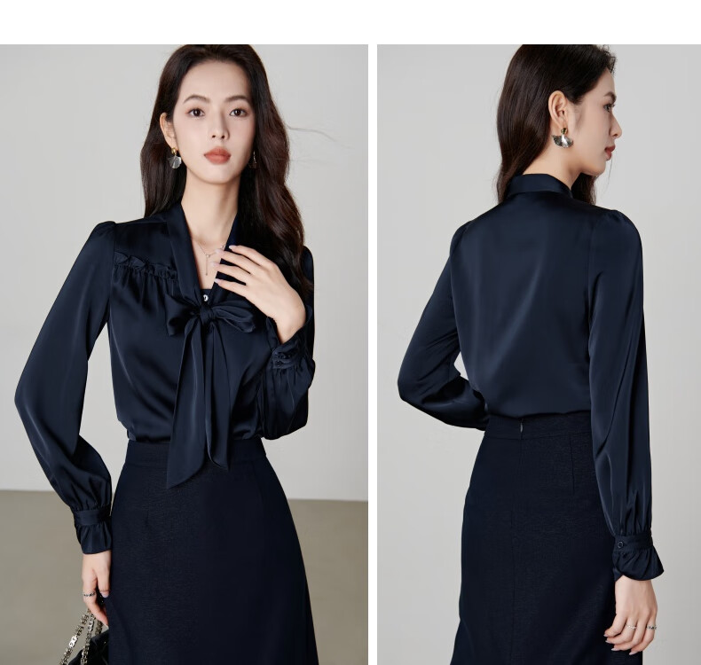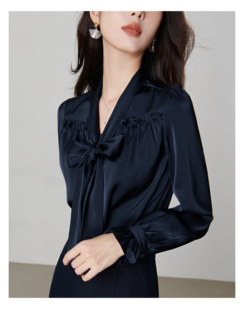 Late White New Product 2025 Autumn Solid Color Bow Tie Collar Top Elegant and Versatile Shirt for Women Dark Blue M