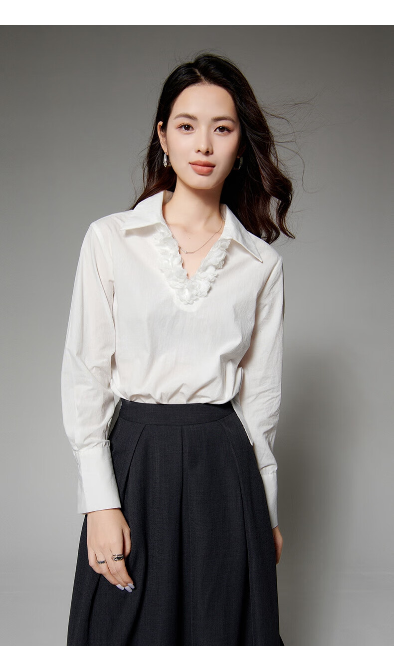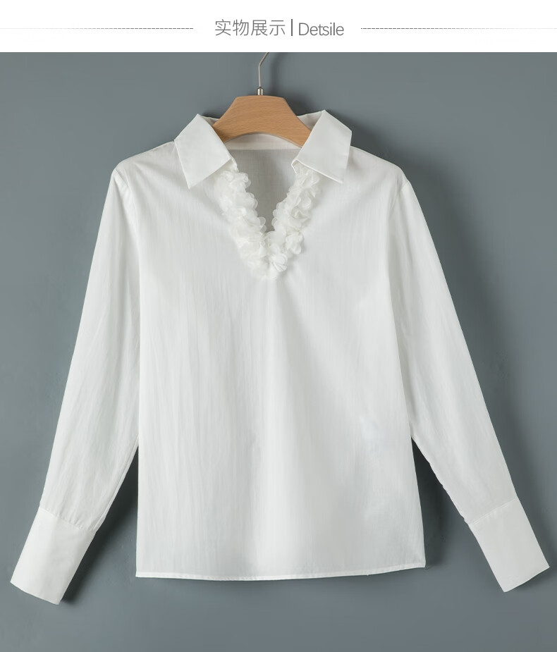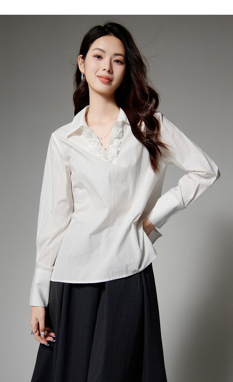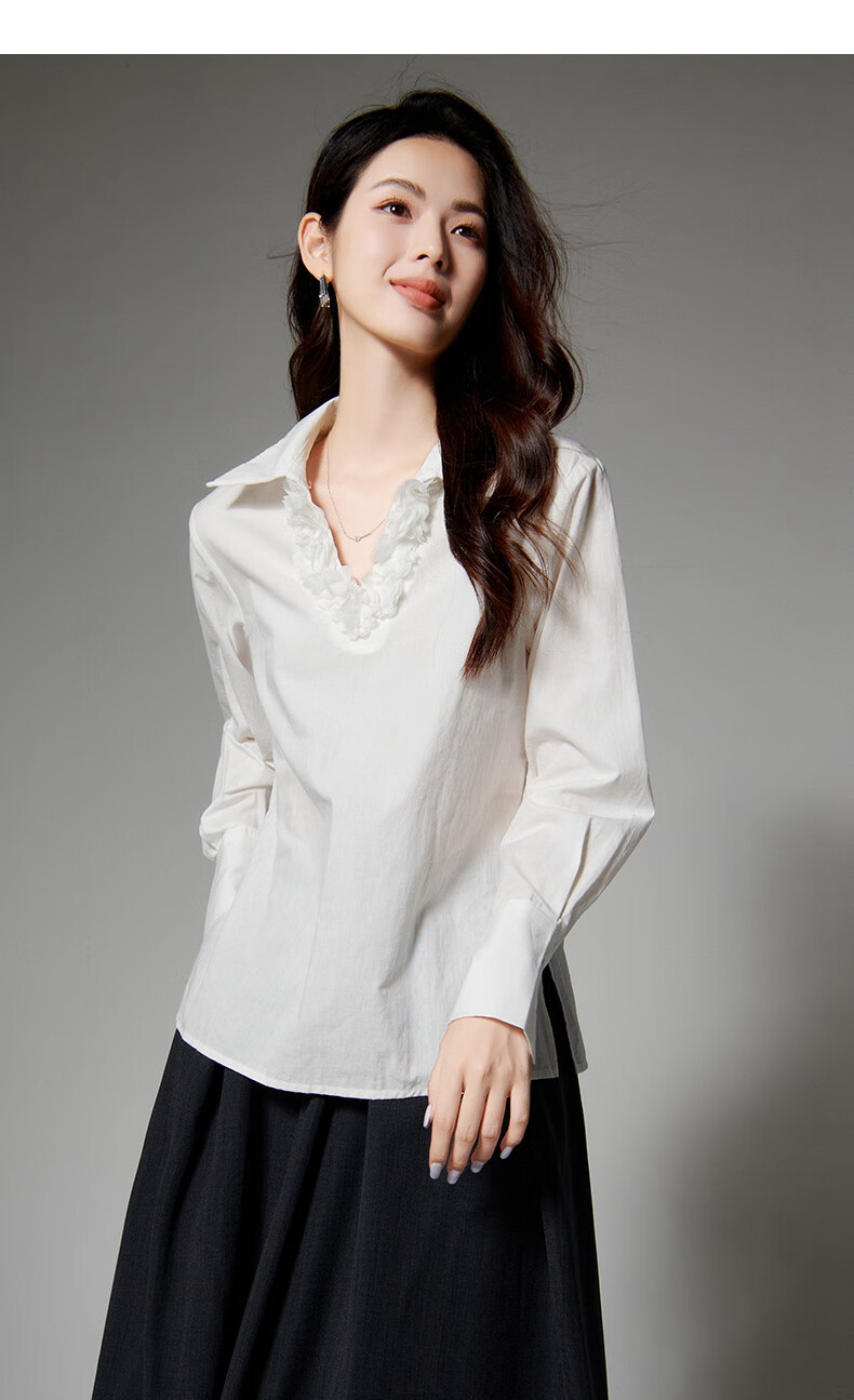 Late white off-size clearance temperament V-neck cotton shirt temperament lace collar light mature style shirt for women white L