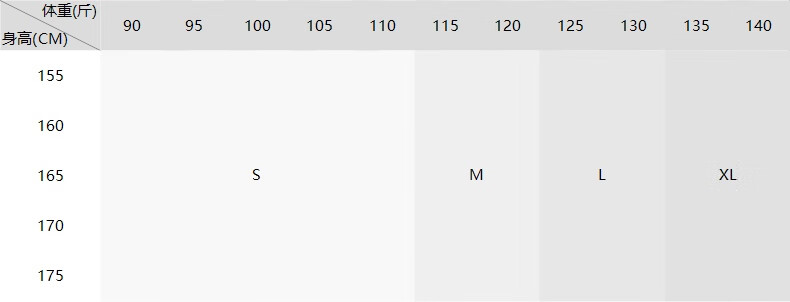 China (cm) 160-165/84-86 165-170 / 88-90 167-172 / 92-96 168-173 / 98-102 170-176 / 106-110