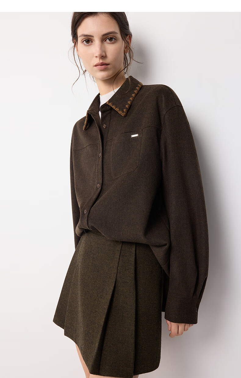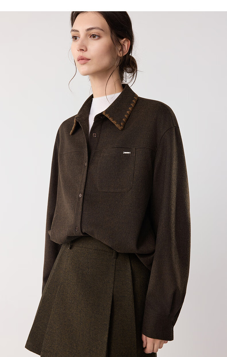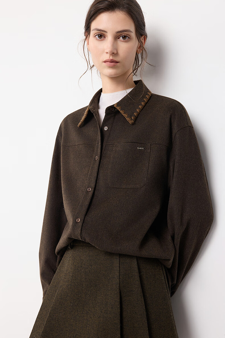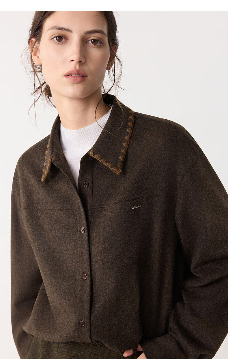 ELLE Retro Sheep Wool Embroidered Lapel Shirt Women's 2025 Winter New Design Loose Niche Shirt Brown S