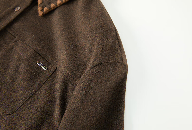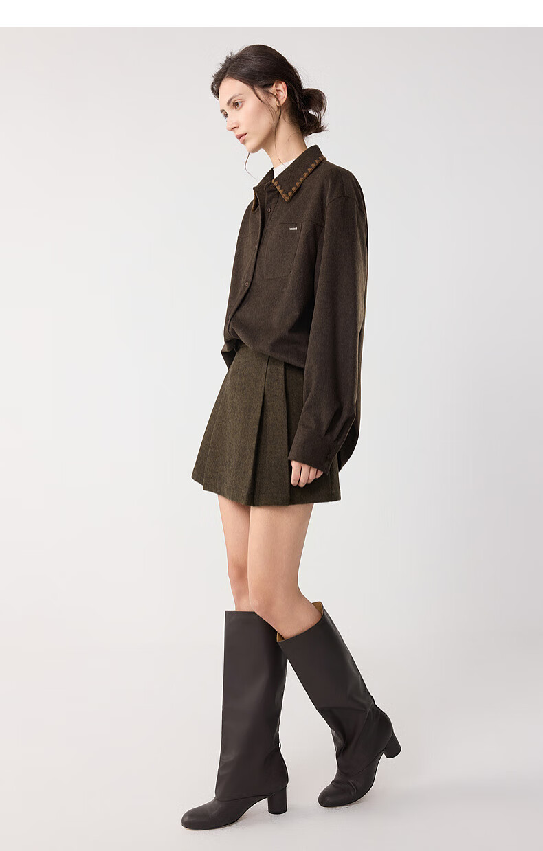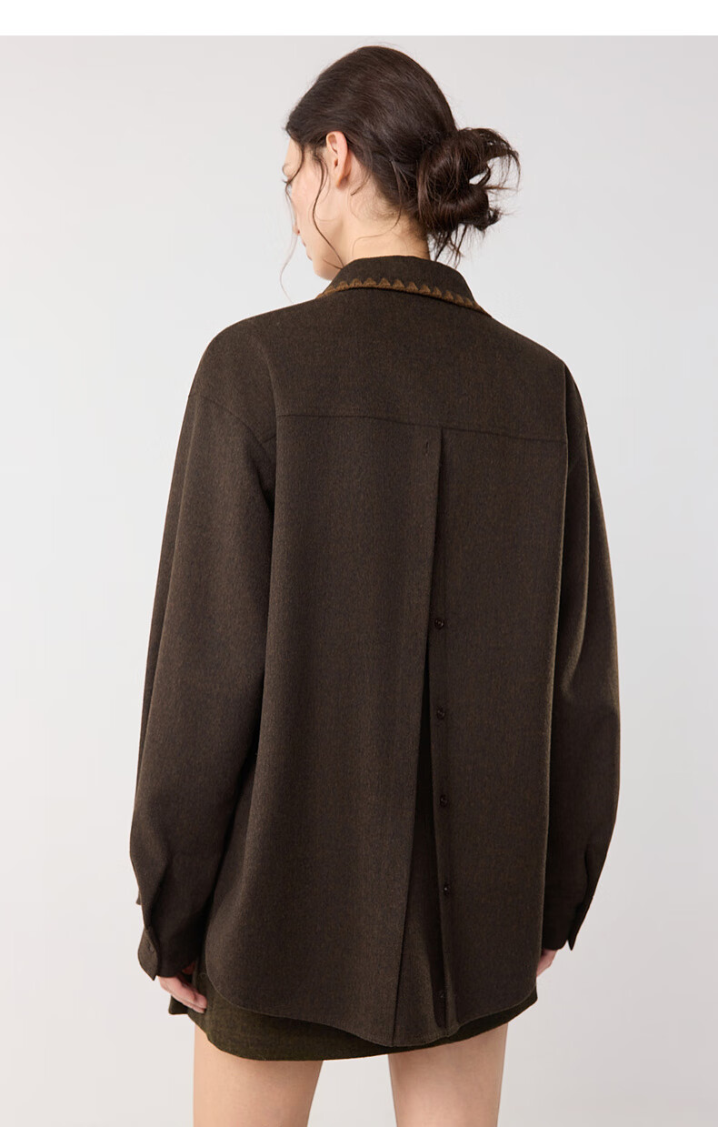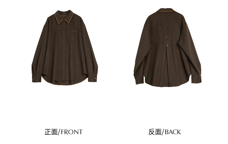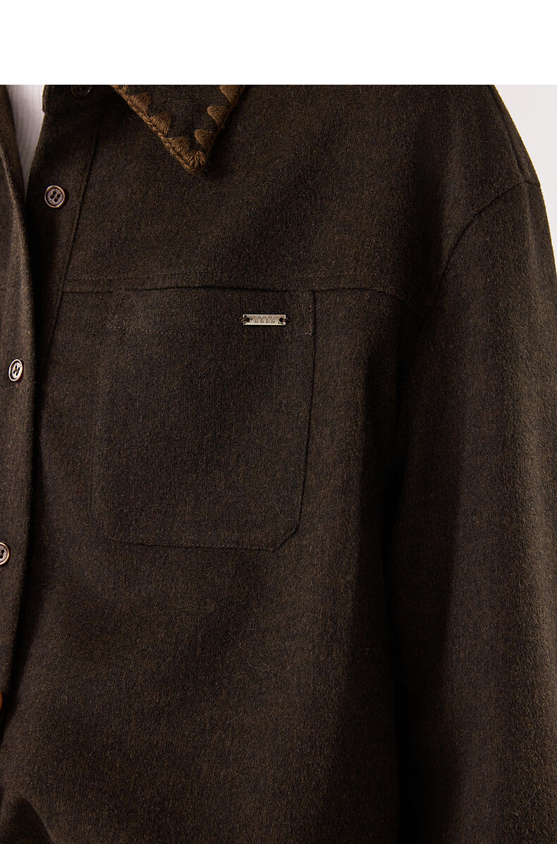 ELLE Retro Sheep Wool Embroidered Lapel Shirt Women's 2025 Winter New Design Loose Niche Shirt Brown S