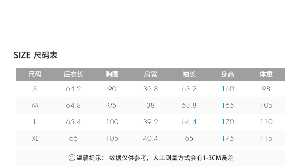 China (cm) 160-165/84-86 165-170 / 88-90 167-172 / 92-96 168-173 / 98-102 170-176 / 106-110