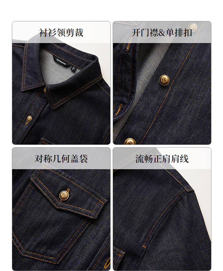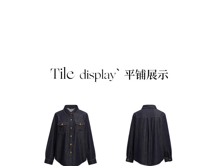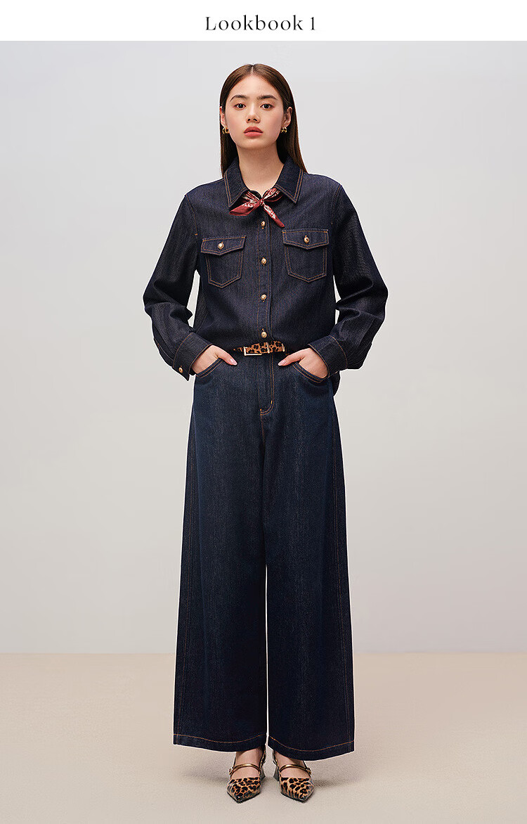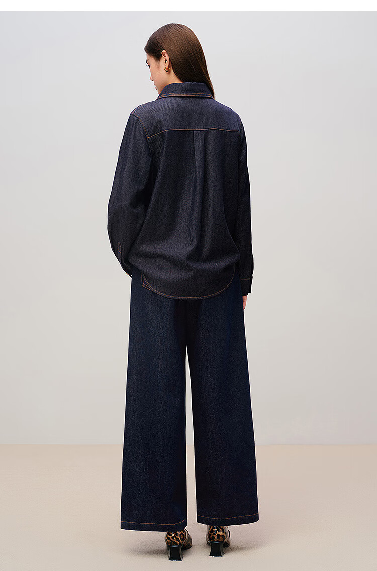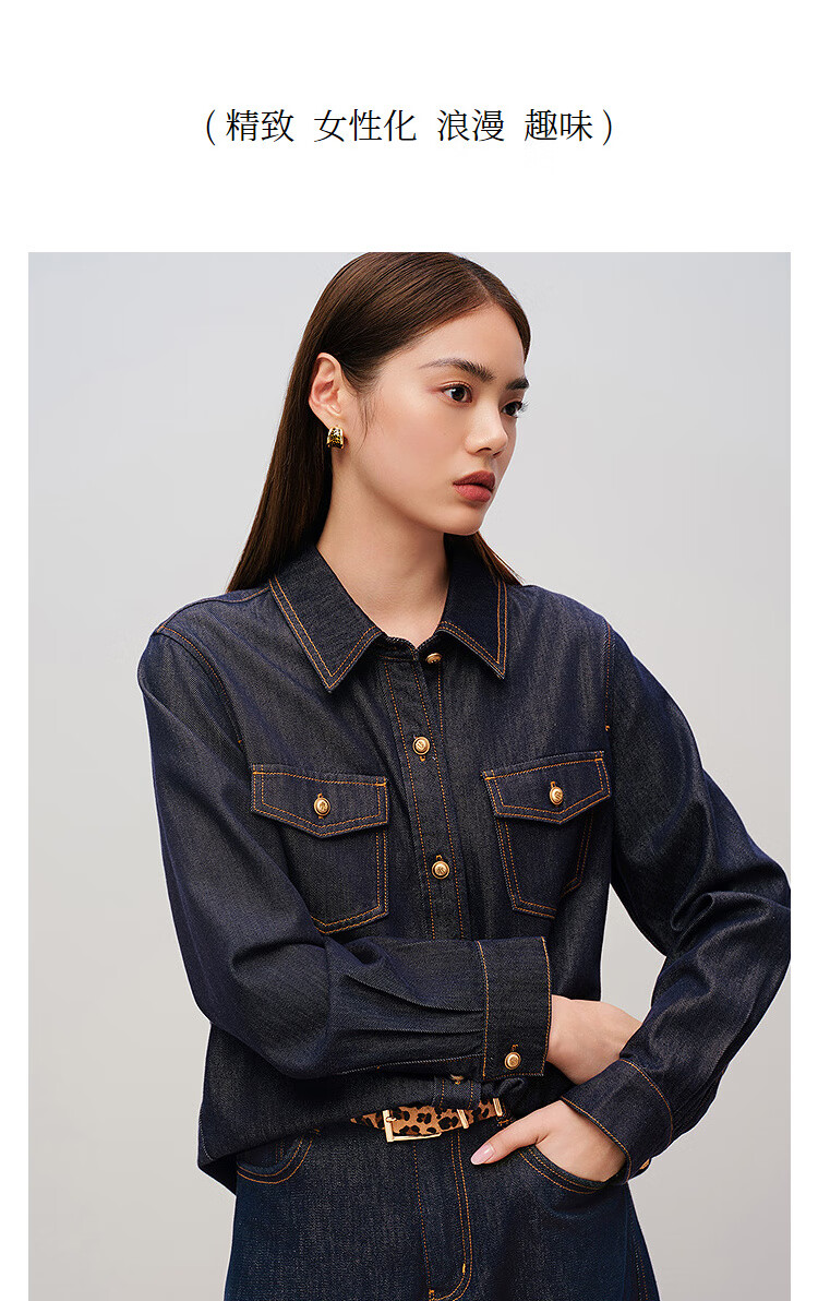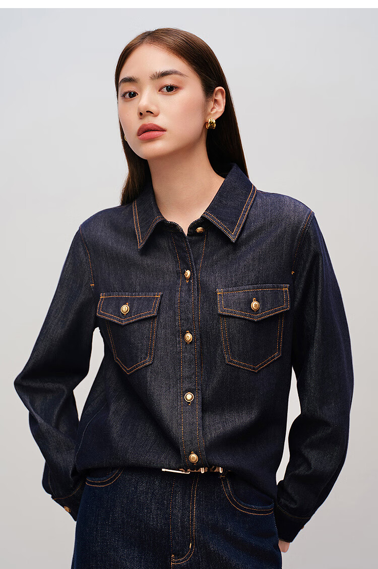 Red Sleeve (hopeshow) 2025 Autumn New Women's Clothing Retro Washed Single Breasted Right Shoulder Long Sleeve Lapel Denim Shirt Dark Denim Blue 072 M
