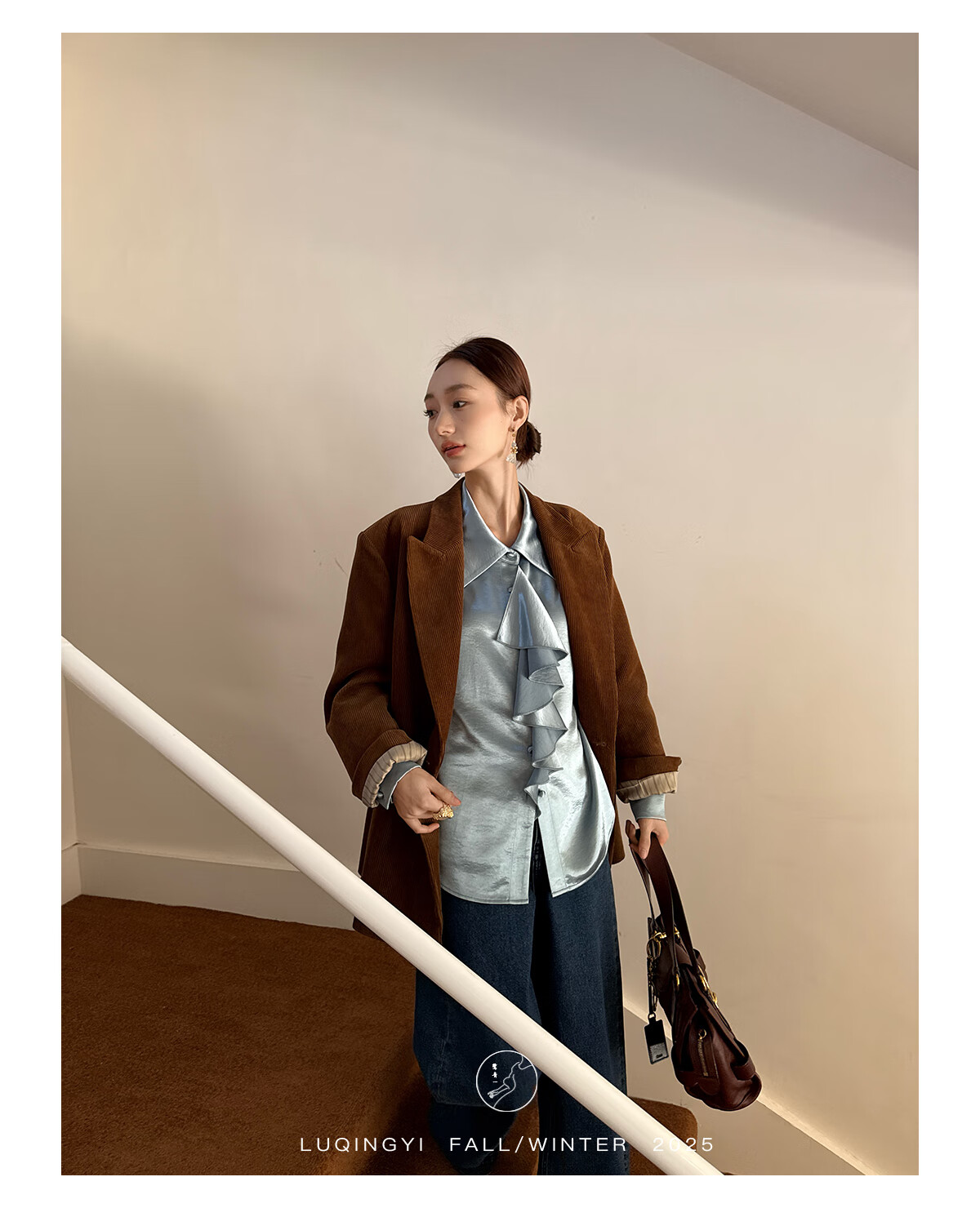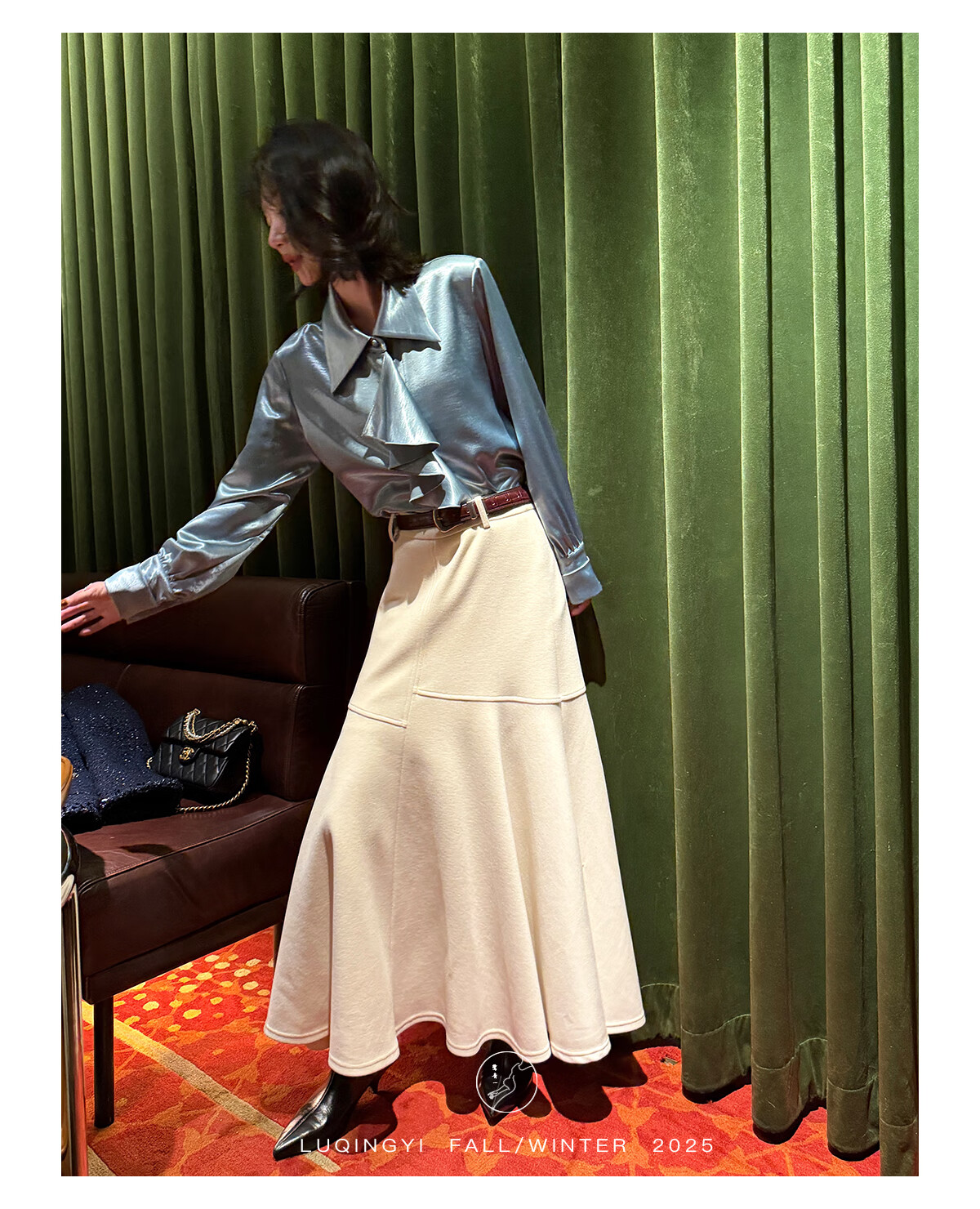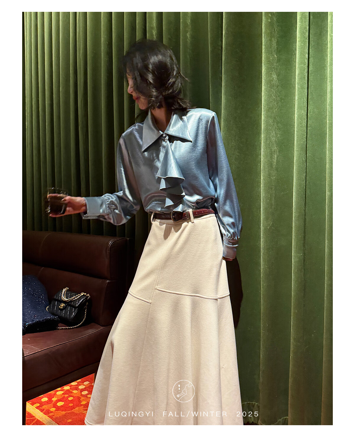 Lu Qingyi original curly haze retro glossy satin shirt women's autumn and winter design ruffled casual top champagne color M photo wear
