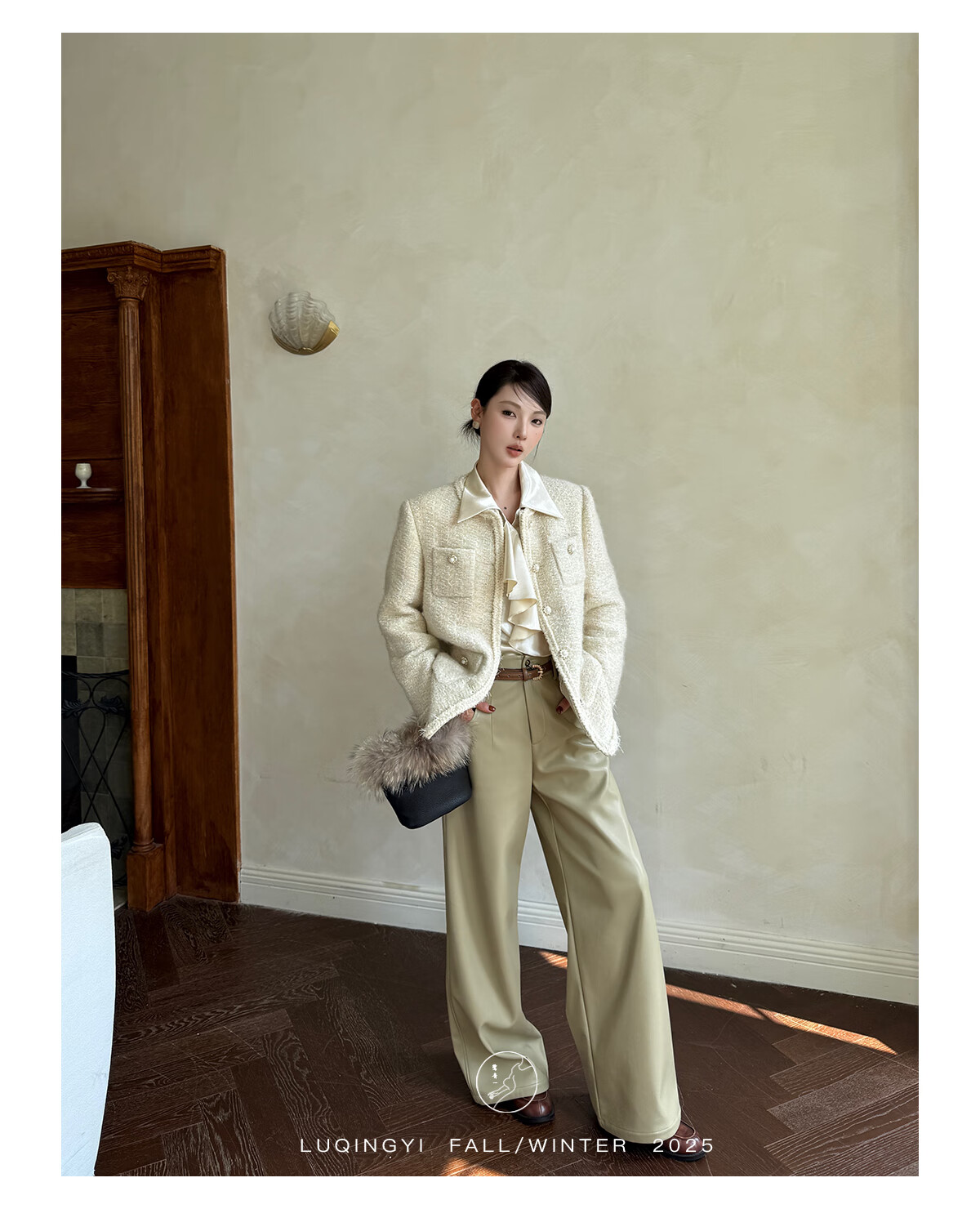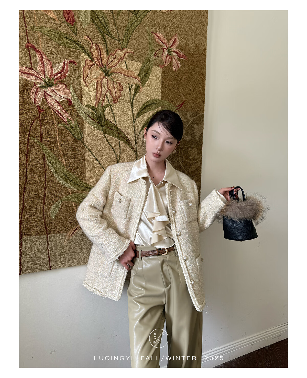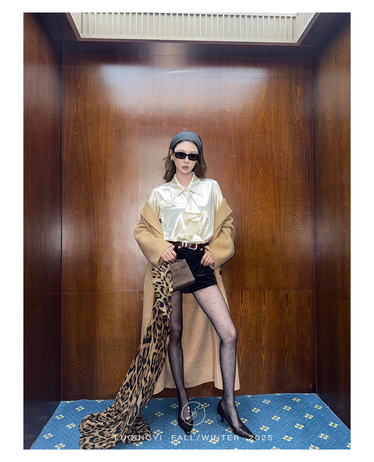 Lu Qingyi original curly haze retro glossy satin shirt women's autumn and winter design ruffled casual top champagne color M photo wear