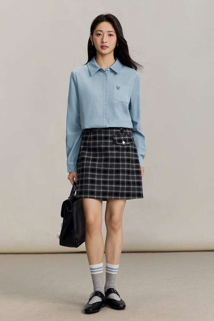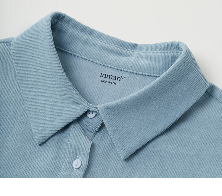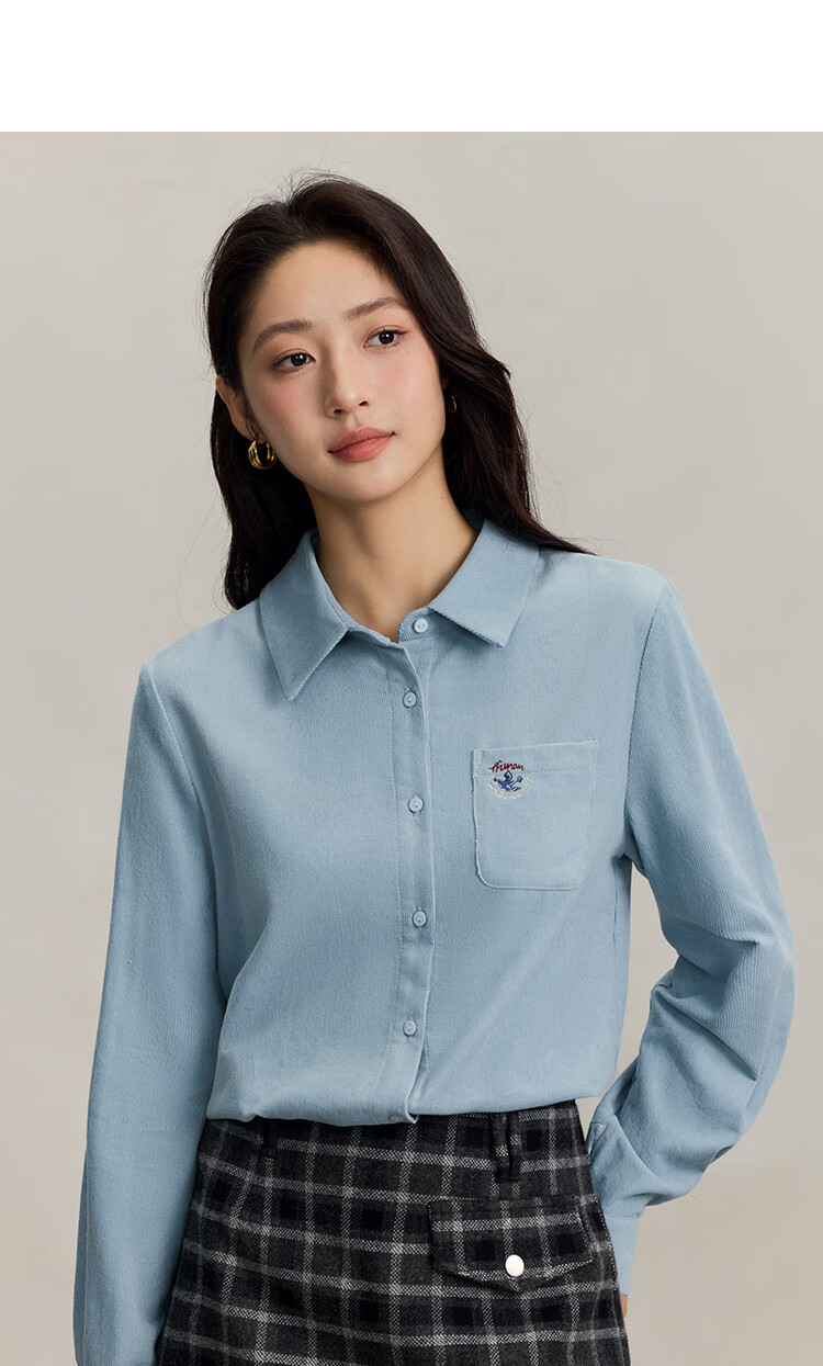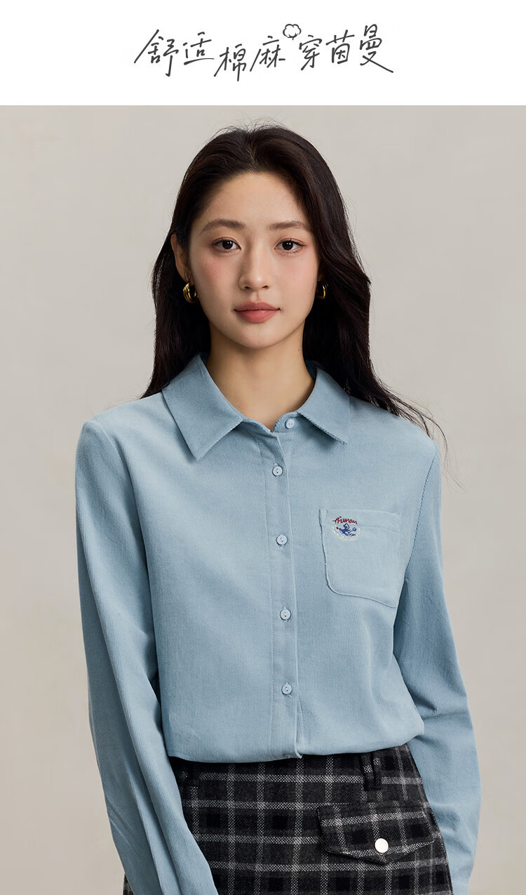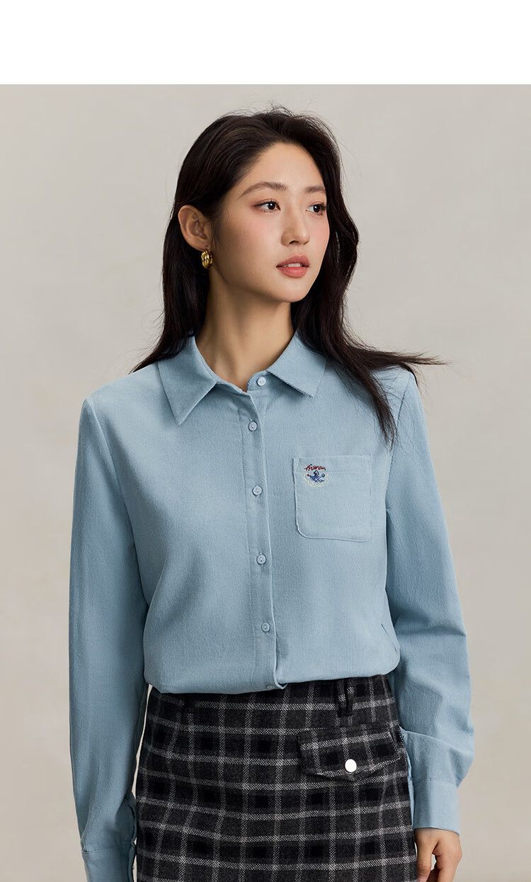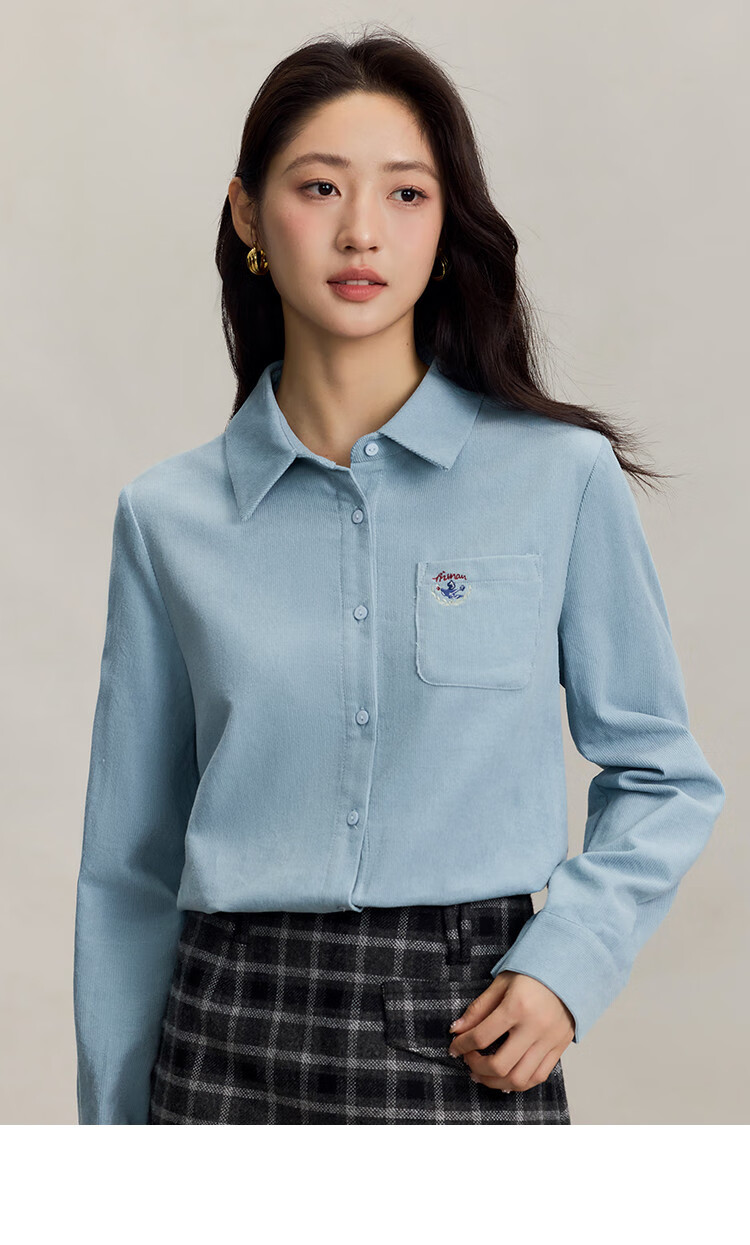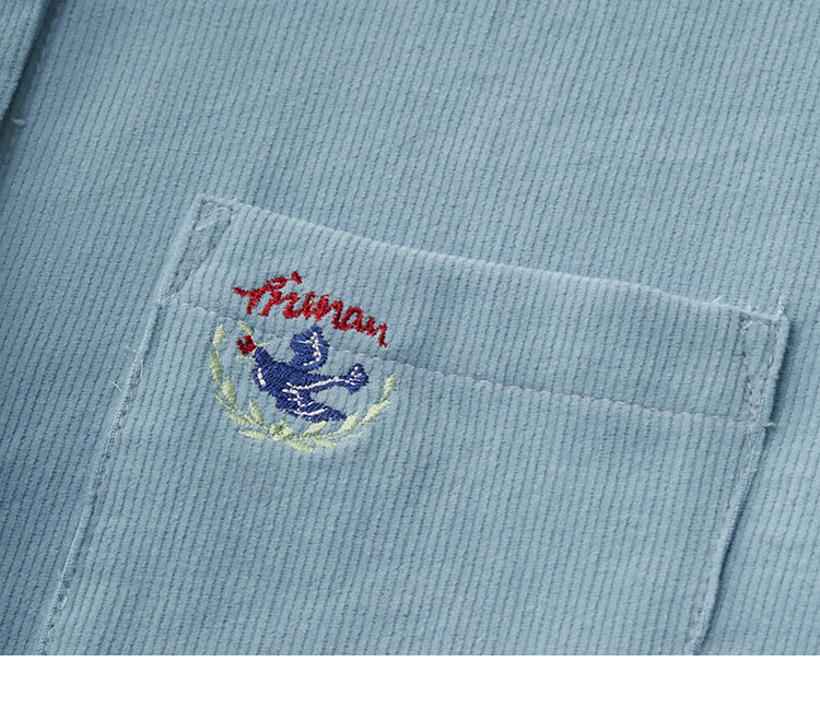 INMAN pure cotton simple commuter long-sleeved shirt for women 2025 autumn retro embroidered loose lapel corduroy shirt light aqua XL