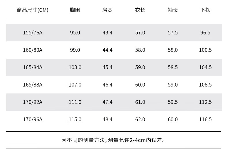 China (cm) 160-165/84-86 165-170 / 88-90 167-172 / 92-96 168-173 / 98-102 170-176 / 106-110