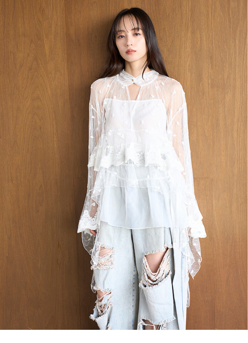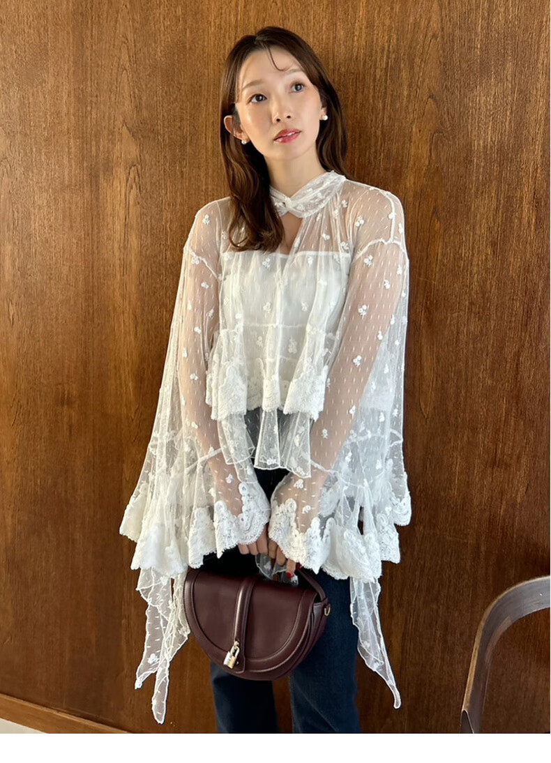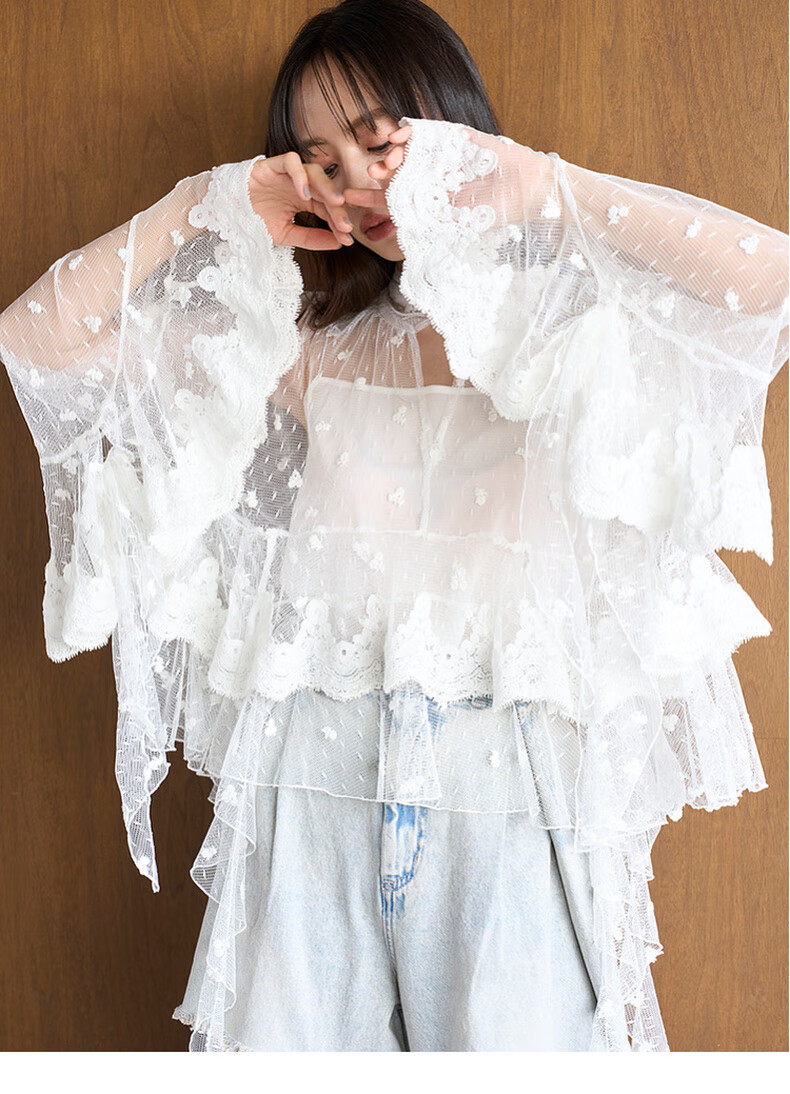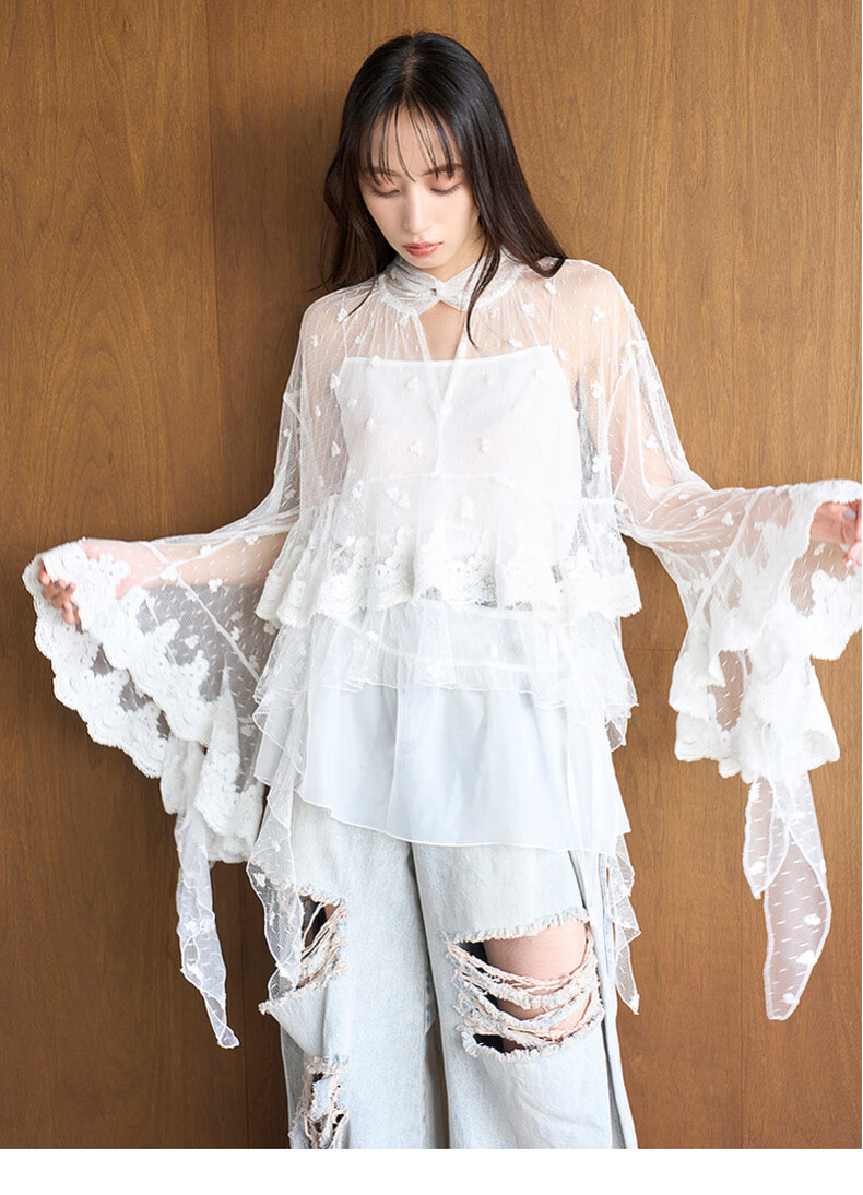 SNIDEL2025 new autumn and winter elegant jacquard lace embroidered ruffle bell sleeve shirt SWFB255147 flower pattern one size fits all (F)